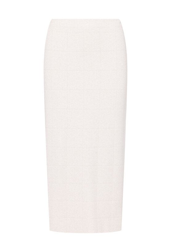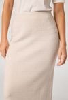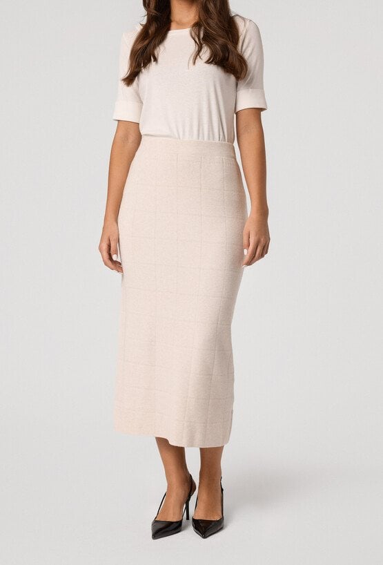 Beżowa spódnica dzianinowa o długości midi to klasyka, która robi robotę w każdej szafie. Ołówkowy fason podkreśla sylwetkę, a elastyczna talia zapewnia komfort noszenia przez cały dzień. Miękka, przyjemna w dotyku dzianina dobrze układa się na ciele i sprawdzi się zarówno w stylizacjach biurowych, jak i bardziej casualowych.To model, który łatwo zestawisz z koszulą, swetrem lub dopasowanym topem. Neutralny kolor daje pełną swobodę stylizacji, a długość midi dodaje elegancji bez zbędnego patosu. Krótko mówiąc: bezpieczna inwestycja, która długo się broni.