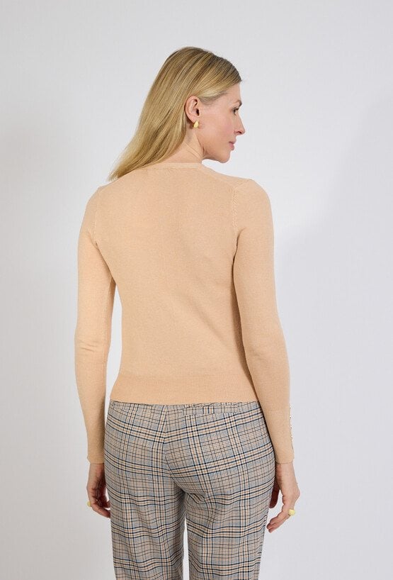 Elegancki kardigan damski w ciepłym beżowym odcieniu to ponadczasowa propozycja dla kobiet ceniących klasykę i wygodę. Model QUIOSQUE posiada kobiecy dekolt w kształcie litery V oraz ozdobne guziki na całej długości, które podkreślają jego elegancki charakter. Dopasowany fason pięknie układa się na sylwetce, a miękka, przyjemna w dotyku dzianina zapewnia komfort noszenia przez cały dzień.