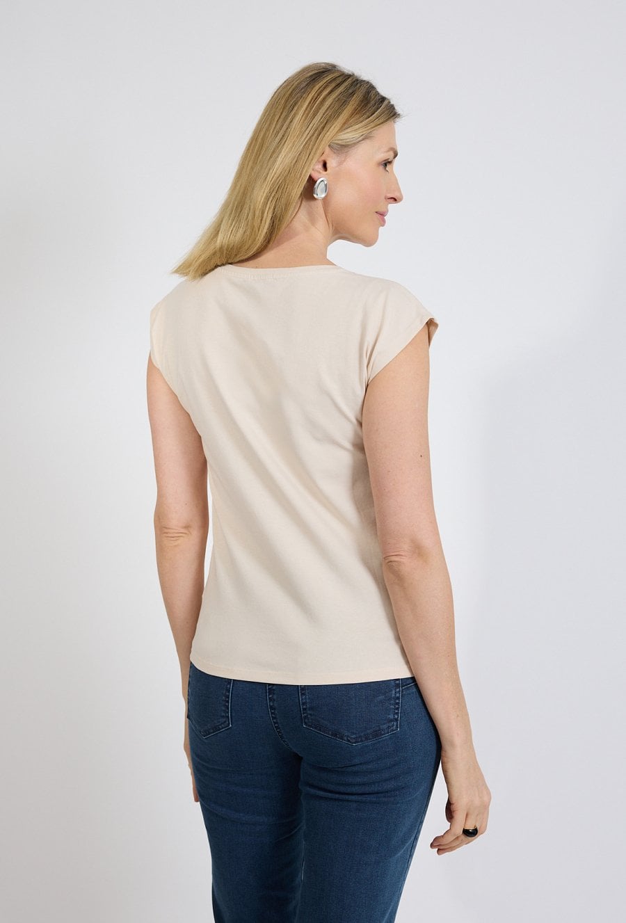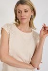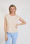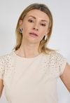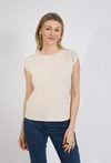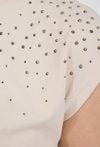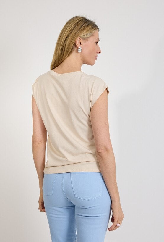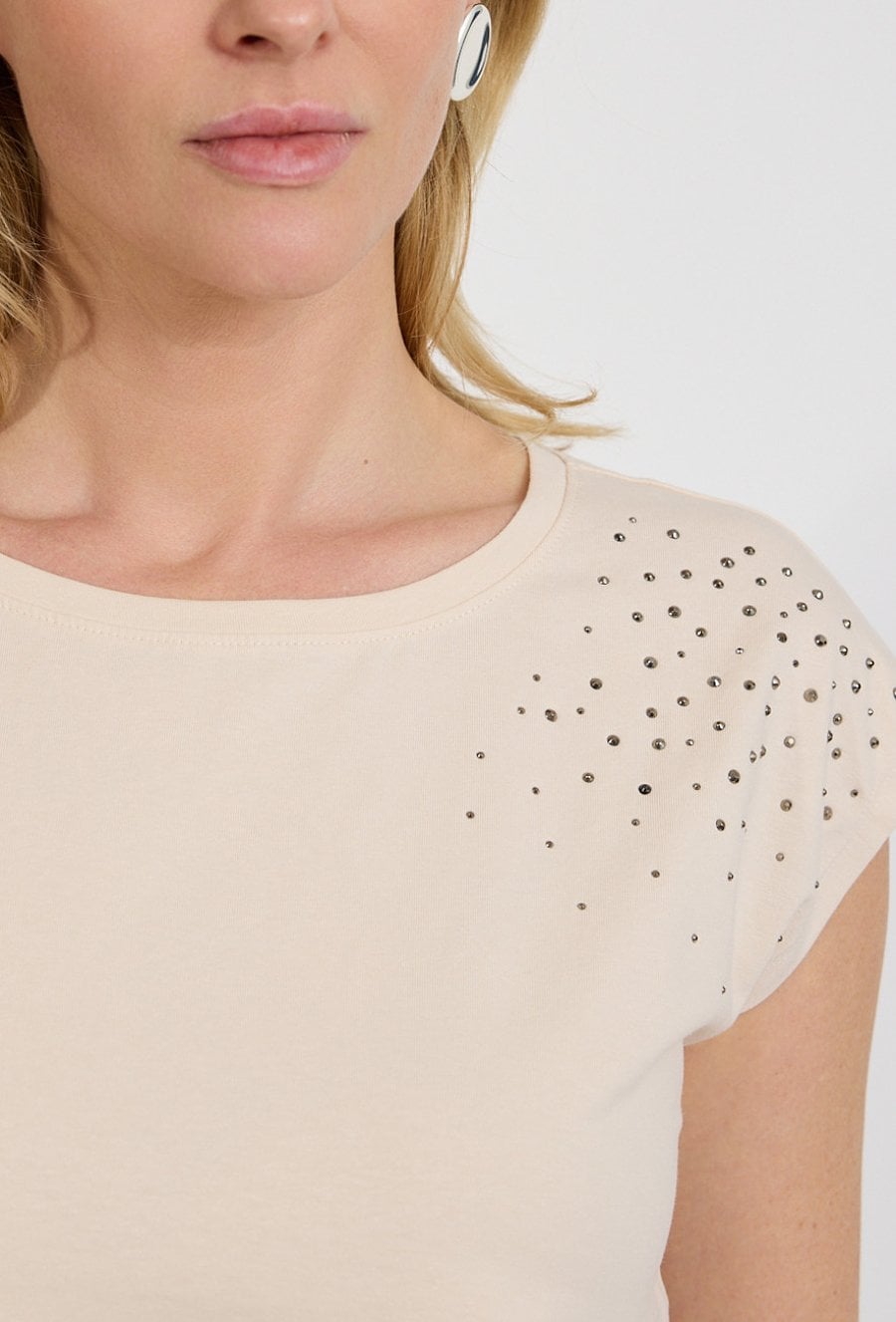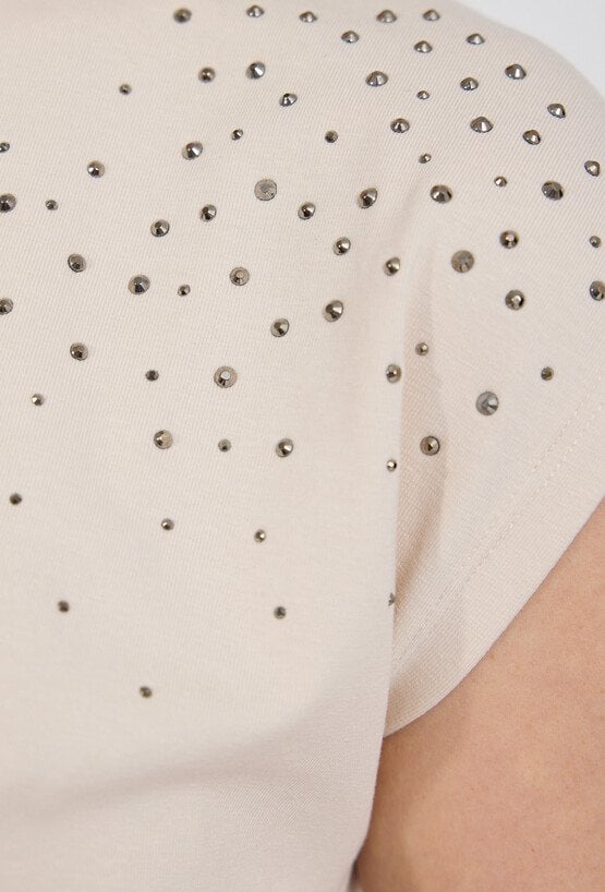 Beżowy t-shirt damski z ozdobnymi nitami na ramionach