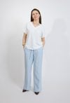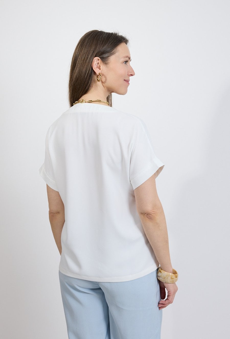 Klasyczna biała bluzka damska to ponadczasowy element garderoby, który doskonale sprawdzi się w wielu stylizacjach. Minimalistyczny design oraz uniwersalny kolor sprawiają, że model jest niezwykle elegancki i łatwy do zestawienia z różnymi elementami garderoby. Bluzka posiada kobiece wycięcie w kształcie litery V, które subtelnie podkreśla linię szyi i nadaje stylizacji lekkości. Krótki rękaw z delikatnym podwinięciem zapewnia komfort noszenia i sprawia, że model idealnie sprawdzi się w cieplejsze dni. Dzięki prostemu fasonowi bluzka świetnie wygląda zarówno z eleganckimi spodniami, jak i ze spódnicą lub jeansami, tworząc stylowe zestawy do pracy i na co dzień. Modelka ma 172 cm wzrostu i nosi rozmiar 38/M