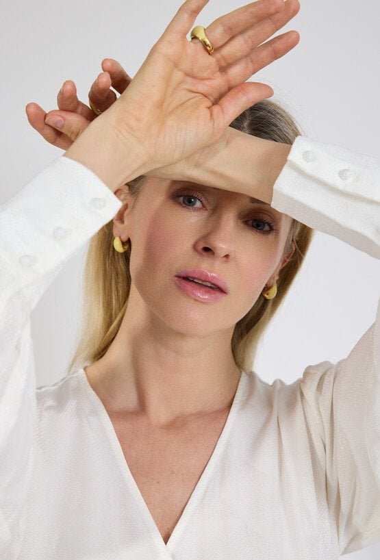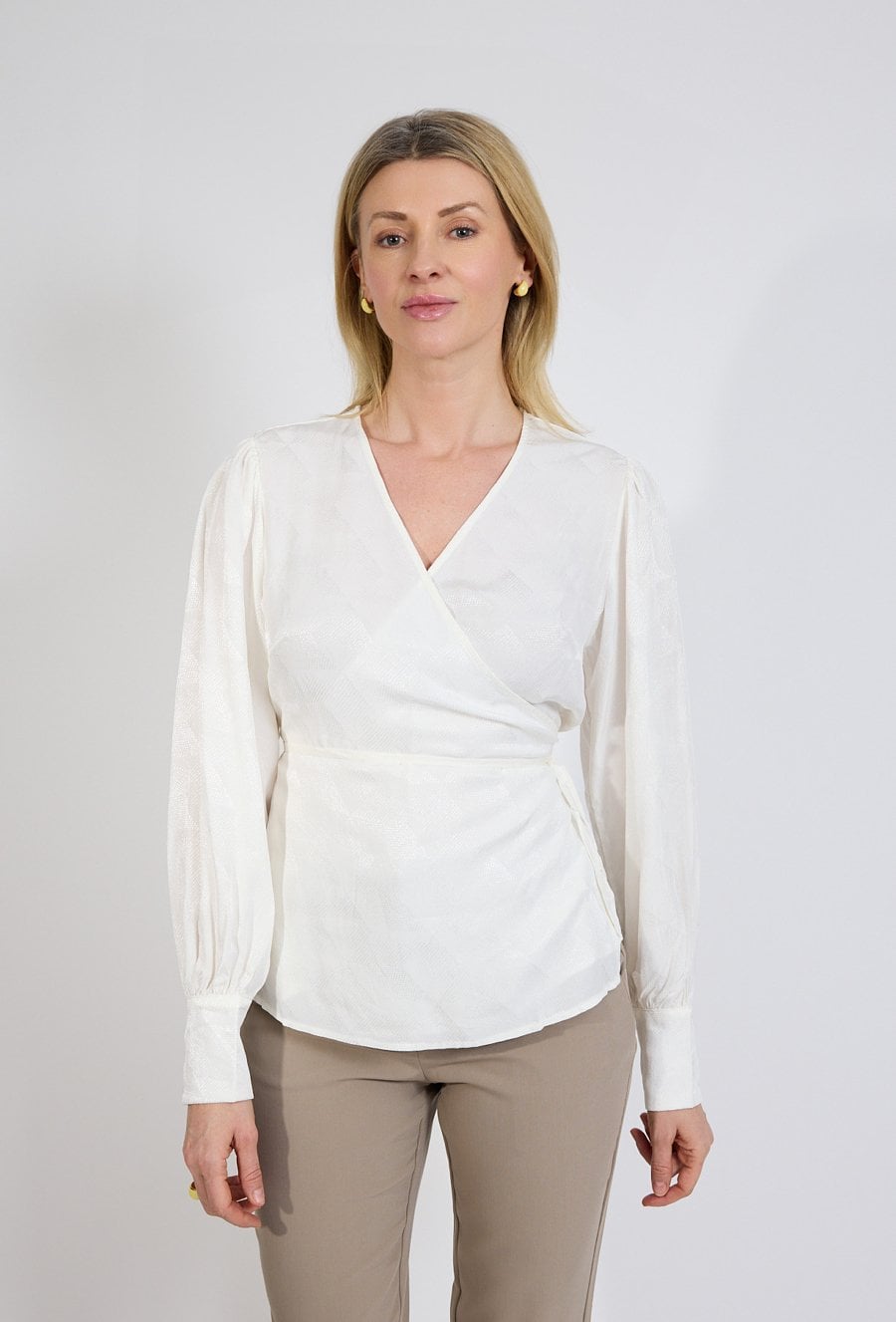 Biała bluzka z kopertowym dekoltem to klasyczna i elegancka propozycja, która świetnie sprawdzi się zarówno w stylizacjach biurowych, jak i na bardziej formalne okazje. Model posiada delikatną strukturę materiału oraz długie rękawy zakończone szerokim mankietem, co dodaje całości szyku. Wiązanie w talii pozwala na dopasowanie bluzki do sylwetki i pięknie ją podkreśla, jednocześnie wprowadzając lekko kobiecy akcent. Lekki, przyjemny w dotyku materiał zapewnia komfort noszenia przez cały dzień. To uniwersalna baza do wielu stylizacji, która doskonale komponuje się zarówno ze spodniami, jak i spódnicą.