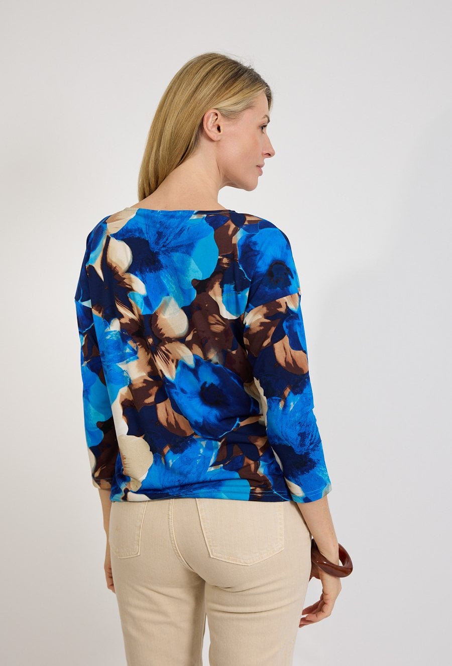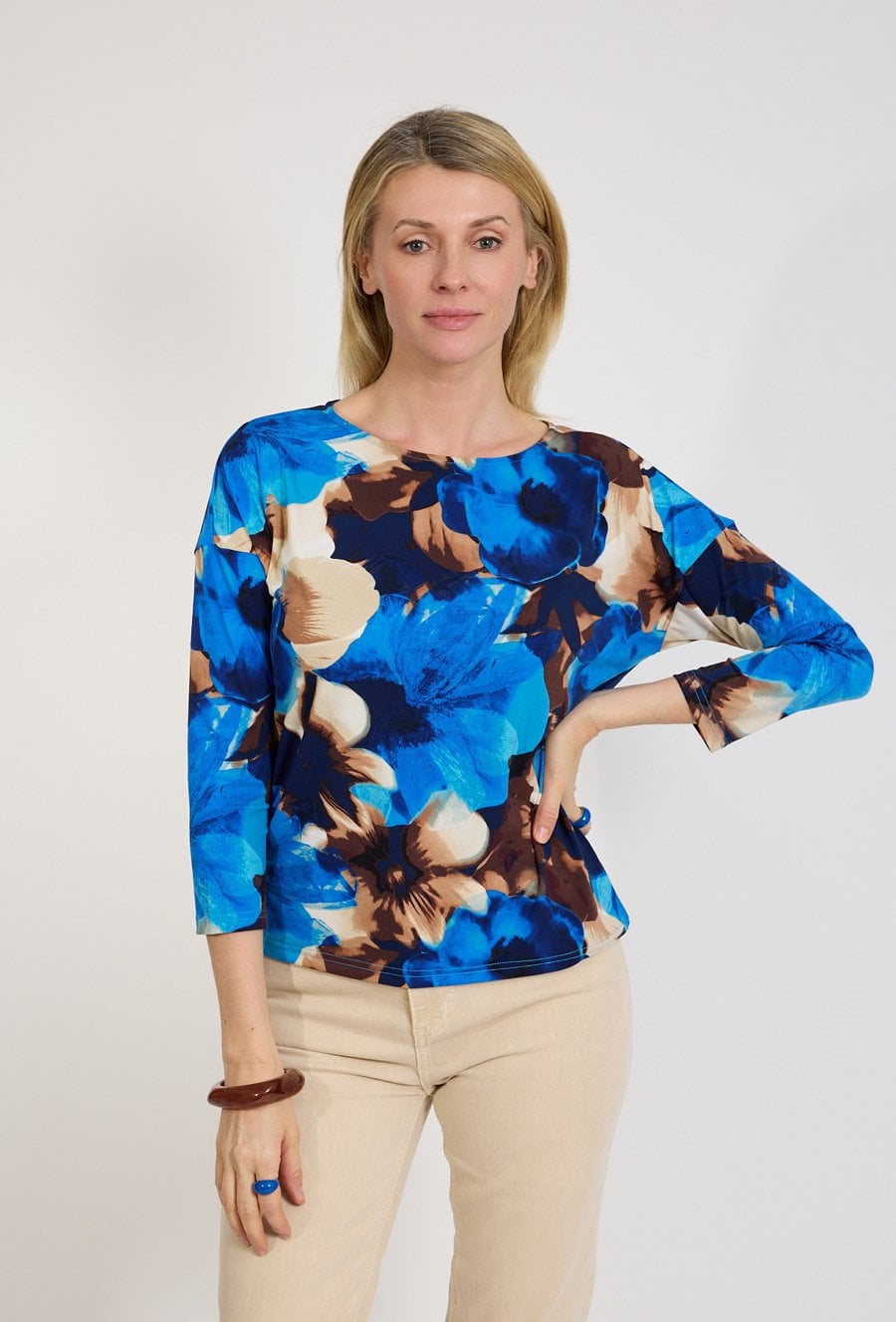 Bluzka damska z niebieskim kwiatowym printem przyciąga uwagę i dodaje świeżości stylizacji. Idealna na co dzień. Modelka ma 179 cm wzrostu i nosi rozmiar 38/M