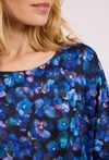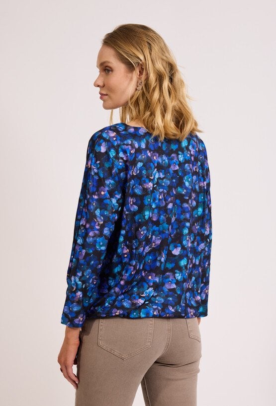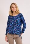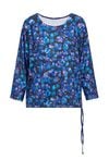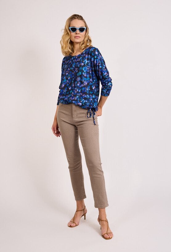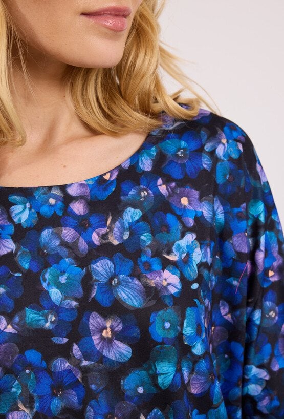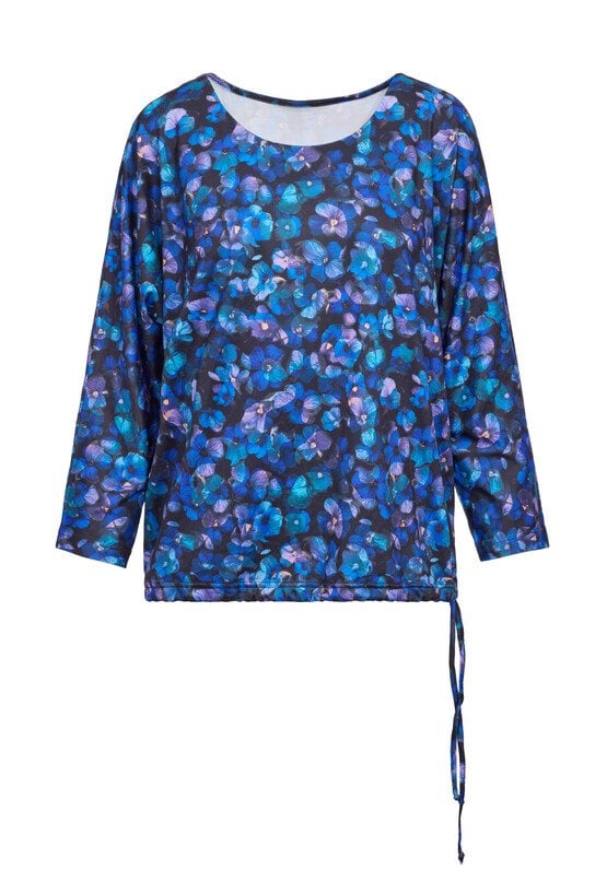 Bluzka w kwiaty z wiązaniem to model o swobodnym fasonie, który wyróżnia się kwiatowym wzorem w odcieniach granatu i błękitu, przeplatanym akcentami fioletu. Dekolt typu łódka optycznie wysmukla szyję, a luźne rękawy 3/4 nadają sylwetce lekkości. Bluzka jest zakończona elastyczną taśmą na wysokości bioder, która pozwala na dopasowanie do sylwetki oraz ozdobne wiązanie z boku. Model doskonale sprawdzi się zarówno w biurze w połączeniu z gładką ołówkową spódnicą, jak i w swobodnych, weekendowych zestawieniach. Można ją również włożyć pod wełniany sweter z dekoltem V, aby stworzyć warstwowy look, który podkreśli subtelny wzór. Modelka ma 178,5 cm wzrostu i nosi rozmiar 38/M