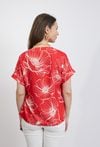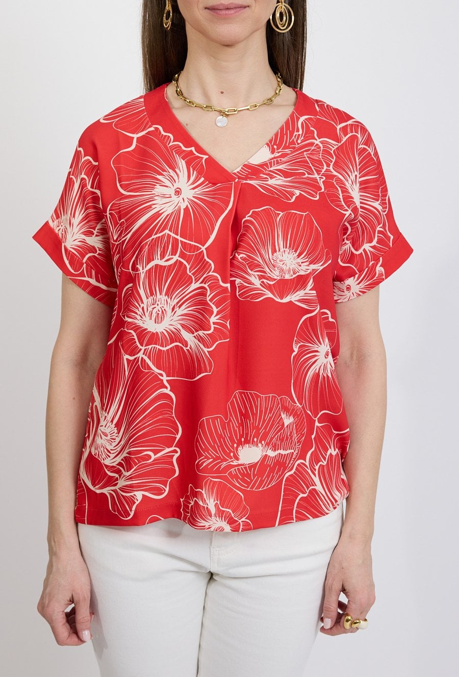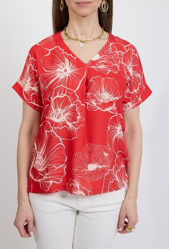 Elegancka bluzka damska w intensywnym czerwonym kolorze ozdobiona dużym kwiatowym wzorem to efektowna propozycja dla kobiet, które lubią wyraziste i kobiece stylizacje. Kontrastowy, jasny motyw kwiatów nadaje modelowi świeżości oraz modnego charakteru. Bluzka posiada kobiece wycięcie w kształcie litery V, które subtelnie podkreśla szyję i wysmukla sylwetkę. Krótki rękaw z delikatnym podwinięciem zapewnia wygodę oraz sprawia, że model doskonale sprawdzi się w cieplejsze dni. Lekki materiał oraz swobodny fason gwarantują komfort noszenia, a wyrazisty wzór sprawia, że bluzka świetnie wygląda zarówno w eleganckich, jak i codziennych stylizacjach. Modelka ma 172 cm wzrostu i nosi rozmiar 38/M