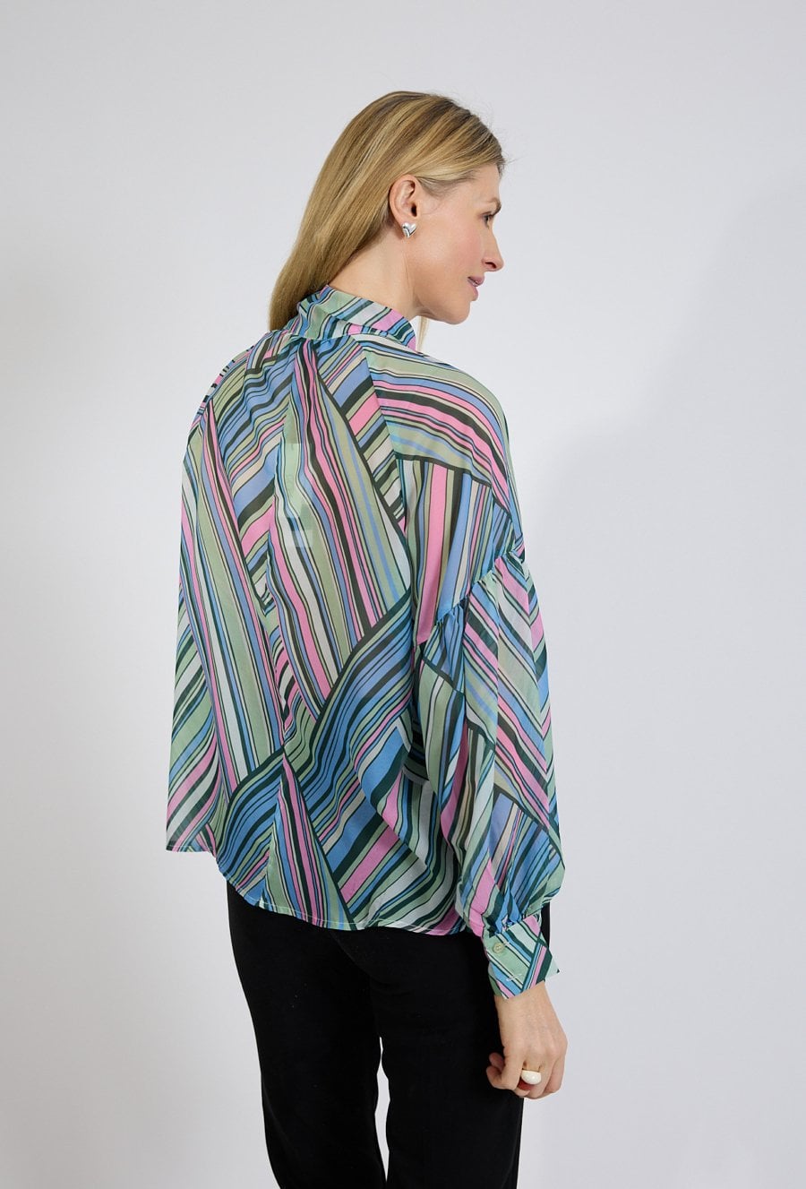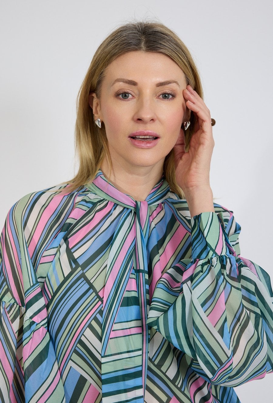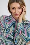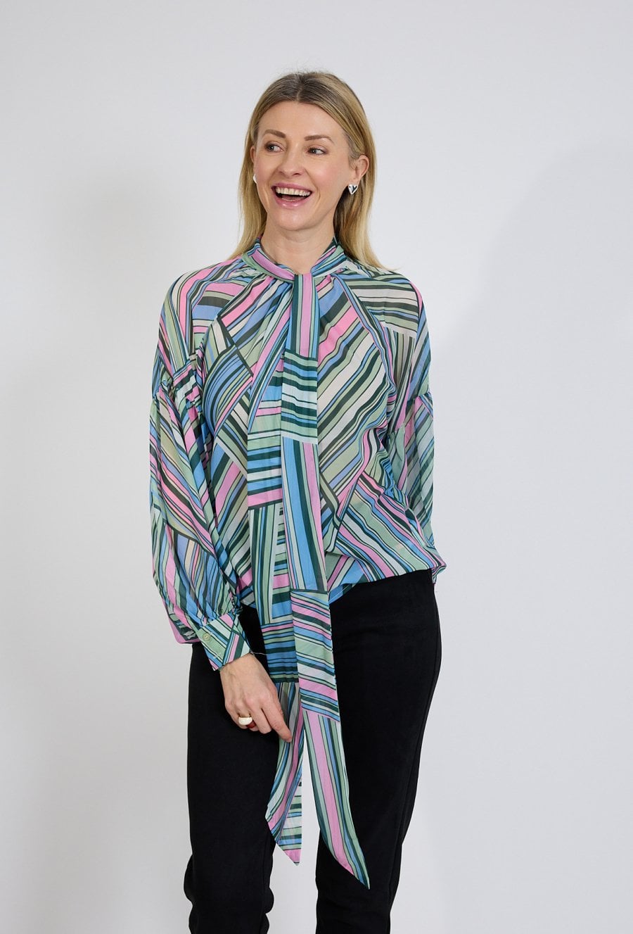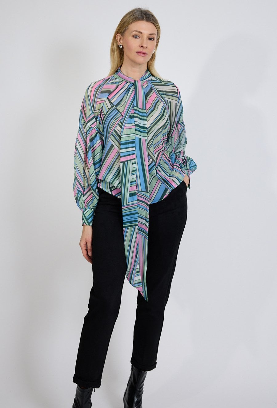 Kolorowa bluzka w geometryczne pasy to wyrazisty element, który ożywi każdą stylizację. Luźny krój zapewnia swobodę i wygodę noszenia, a długie, bufiaste rękawy zakończone mankietami dodają całości lekkości i oryginalnego charakteru. Model został wykończony efektownym wiązaniem pod szyją, które podkreśla kobiecy styl i nadaje eleganckiego akcentu. Bluzka doskonale sprawdzi się zarówno w codziennych, jak i bardziej formalnych zestawach.