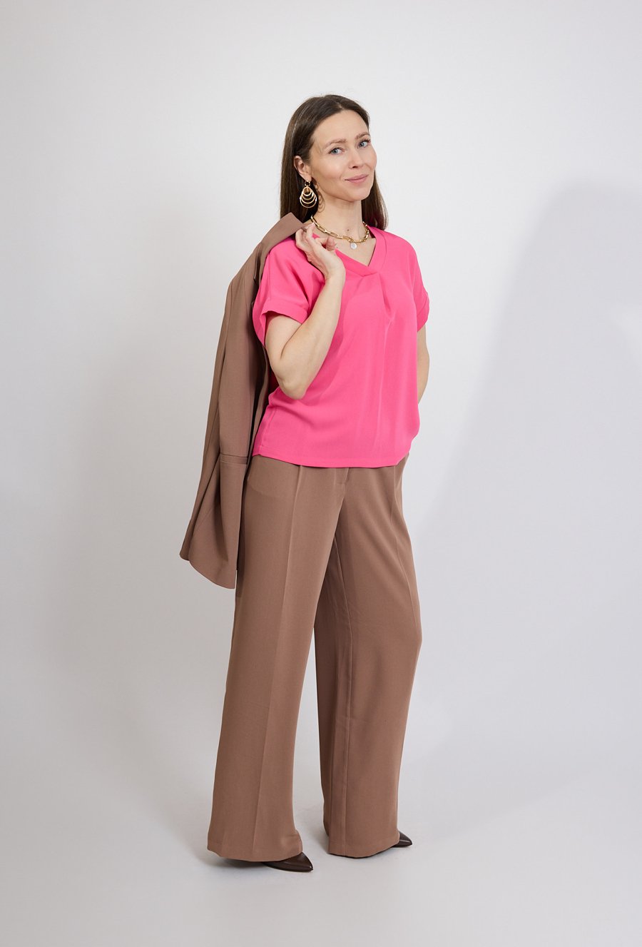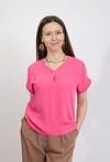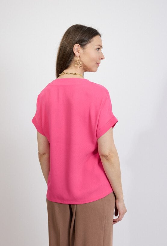 Elegancka bluzka damska w intensywnym różowym kolorze to wyjątkowo kobieca propozycja do wielu stylizacji. Gładki materiał i minimalistyczny fason sprawiają, że model prezentuje się nowocześnie i stylowo, a jednocześnie pozostaje niezwykle wygodny. Bluzka posiada dekolt w kształcie litery V z dekoracyjnym założeniem materiału, który subtelnie podkreśla linię szyi i nadaje całości eleganckiego charakteru. Krótki rękaw z delikatnym podwinięciem zapewnia komfort i sprawia, że model świetnie sprawdzi się w cieplejsze dni. Dzięki uniwersalnemu fasonowi bluzka doskonale pasuje zarówno do eleganckich spodni, jak i do jeansów czy spódnic, tworząc stylowe zestawy na co dzień i do pracy. Modelka ma 172 cm wzrostu i nosi rozmiar 38/M