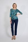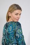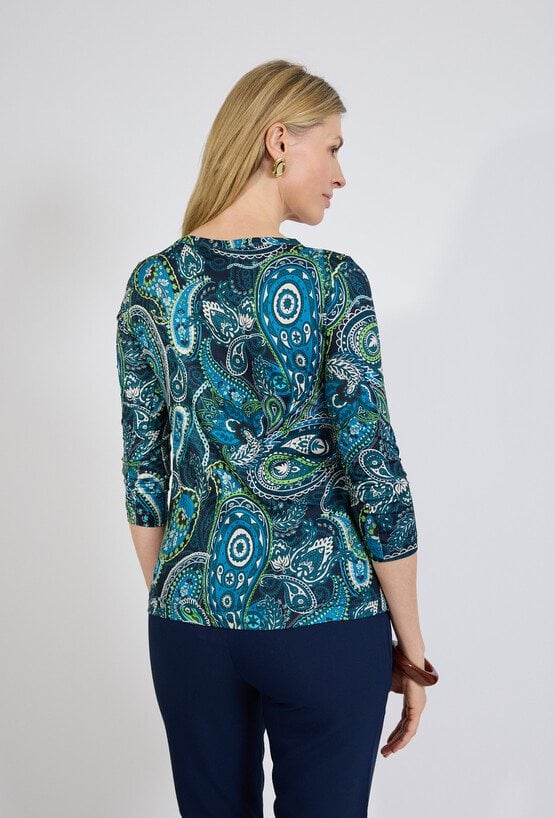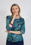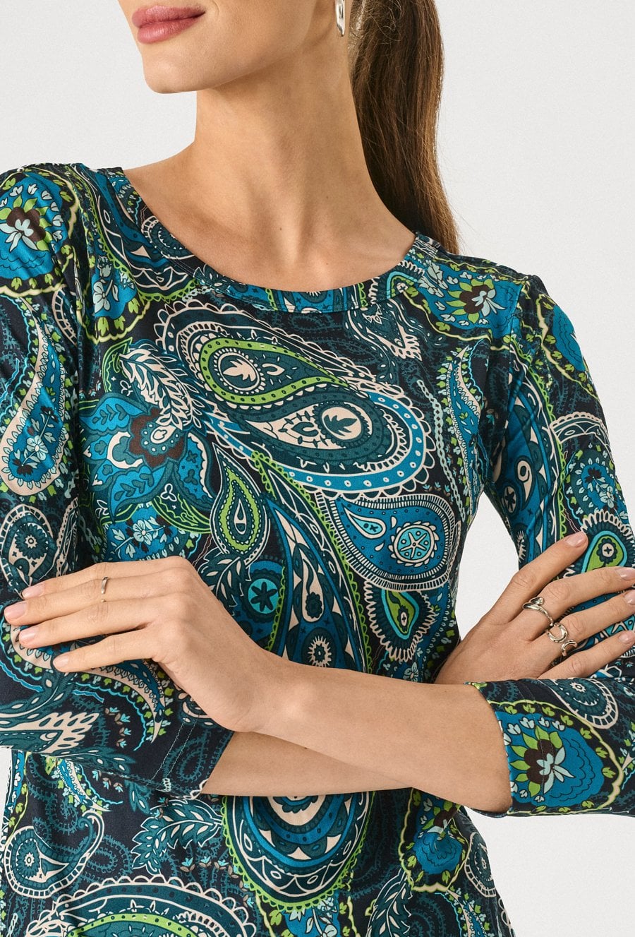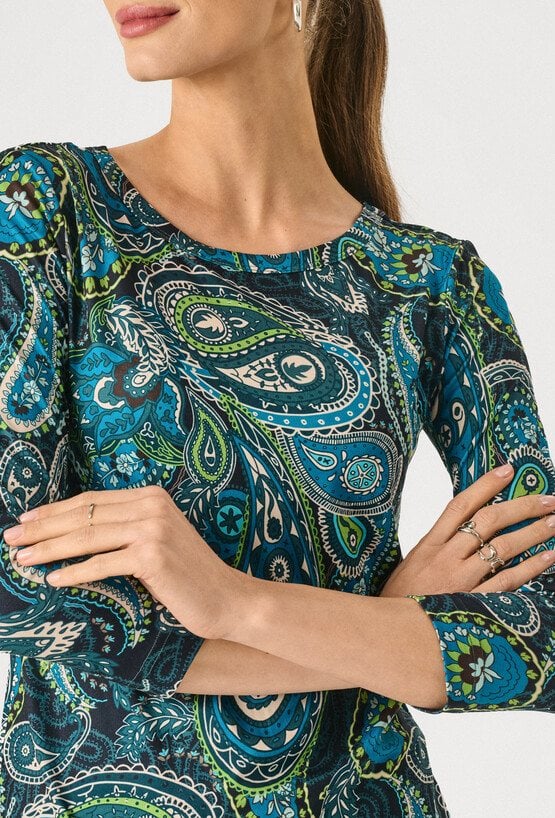 Zielona bluzka w paisley z rękawem 3/4 to klasyczny model, który łączy wyrazisty print z komfortem elastycznej dzianiny. Jej dopasowany krój z szerokim dekoltem w łódkę subtelnie podkreśla sylwetkę, a rękawy o długości 3/4 nadają całości lekkości. Bluzka jest doskonałą bazą do wielu stylizacji. W biurowym zestawie doskonale komponuje się z czarnymi spodniami w kant, a w wersji codziennej tworzy zgrany duet z klasycznymi jeansami. Modelka ma 179 cm wzrostu i nosi rozmiar 38/M