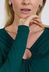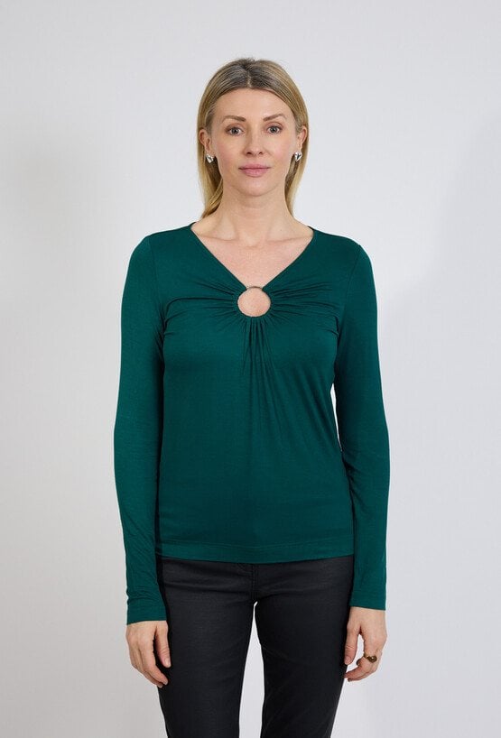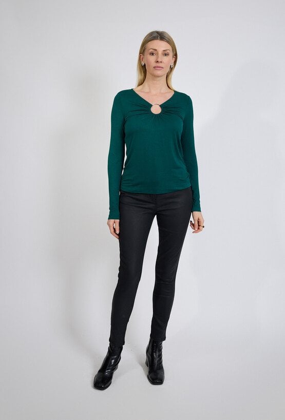 Zielona bluzka z długim rękawem i ozdobnym wycięciem to model, który łączy klasyczną formę z wyraźnym, ale kontrolowanym akcentem. Subtelne marszczenie przy dekolcie oraz metalowe kółko przyciągają uwagę i nadają całości nowoczesnego, kobiecego charakteru, bez przekraczania granic elegancji. Modelka ma 179 cm wzrostu i nosi rozmiar 38/M