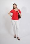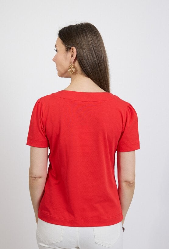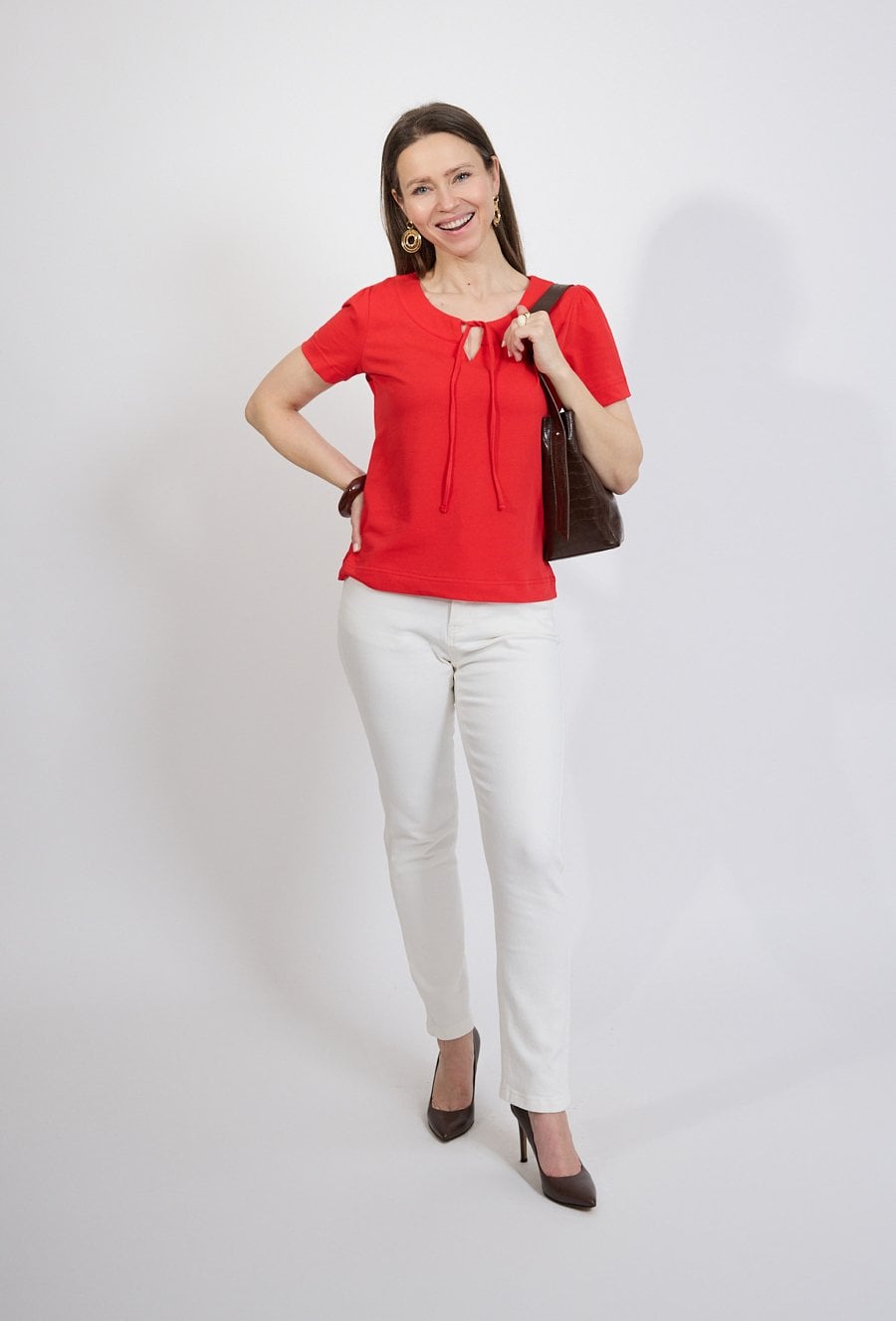 Elegancka bluzka damska w intensywnym czerwonym kolorze to stylowa propozycja dla kobiet, które lubią wyraziste i kobiece elementy garderoby. Klasyczny krój sprawia, że model doskonale sprawdzi się zarówno w codziennych stylizacjach, jak i w bardziej eleganckich zestawach. Bluzka posiada krótkie rękawy oraz subtelny dekolt z dekoracyjnym wiązaniem, który nadaje całości delikatnego i kobiecego charakteru. Prosty fason sprawia, że model pięknie układa się na sylwetce i zapewnia komfort noszenia przez cały dzień. To uniwersalny element garderoby, który świetnie komponuje się zarówno ze spodniami, jak i spódnicą czy eleganckim garniturem.