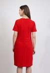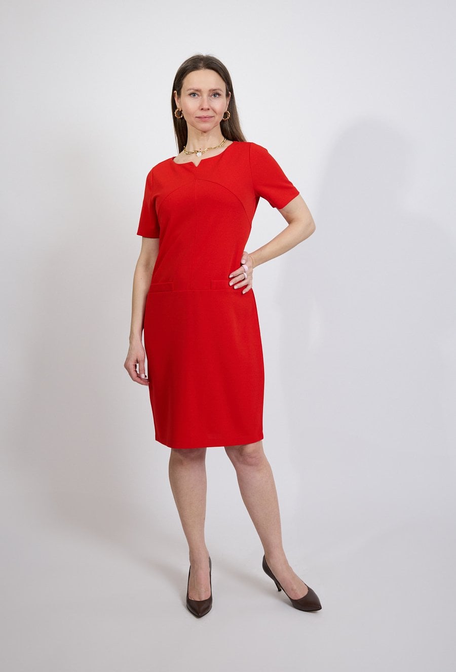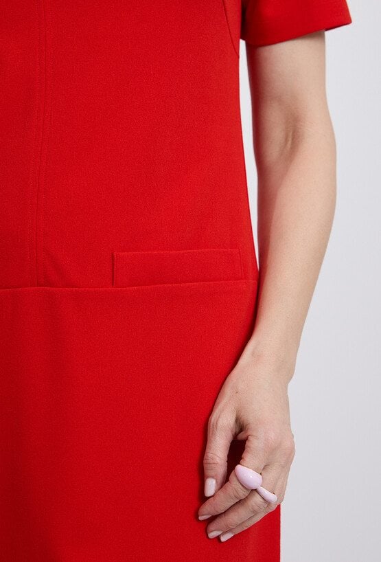 Elegancka sukienka damska w intensywnym czerwonym kolorze to ponadczasowa propozycja dla kobiet, które cenią klasyczny styl i wyraziste kolory. Dopasowany fason pięknie podkreśla sylwetkę, nadając stylizacji kobiecego i eleganckiego charakteru. Sukienka posiada subtelny dekolt z delikatnym wycięciem, który podkreśla linię szyi i nadaje modelowi eleganckiej lekkości. Krótki rękaw zapewnia komfort noszenia, dzięki czemu sukienka świetnie sprawdzi się zarówno w pracy, jak i podczas formalnych spotkań. Model wyróżnia się dopasowanym krojem ołówkowym oraz praktycznymi kieszeniami, które dodają stylizacji nowoczesnego charakteru. To idealna propozycja na spotkania biznesowe, uroczystości czy eleganckie wyjścia. Modelka ma 172 cm wzrostu i nosi rozmiar 38/M