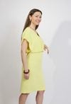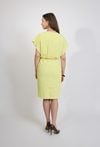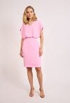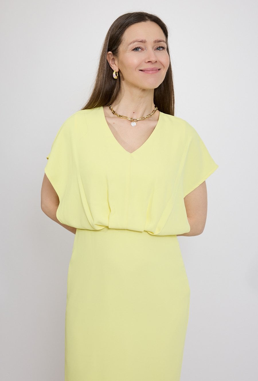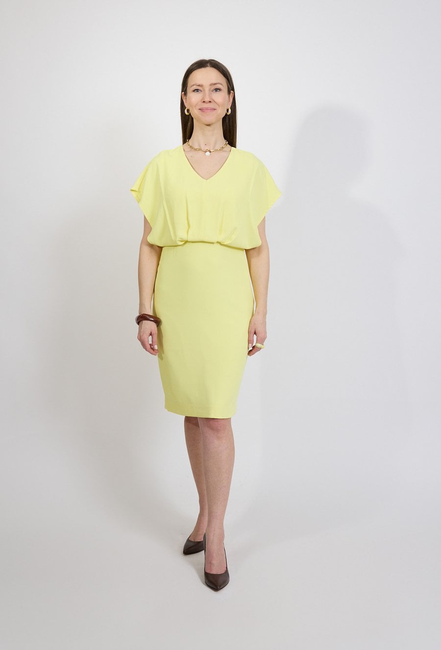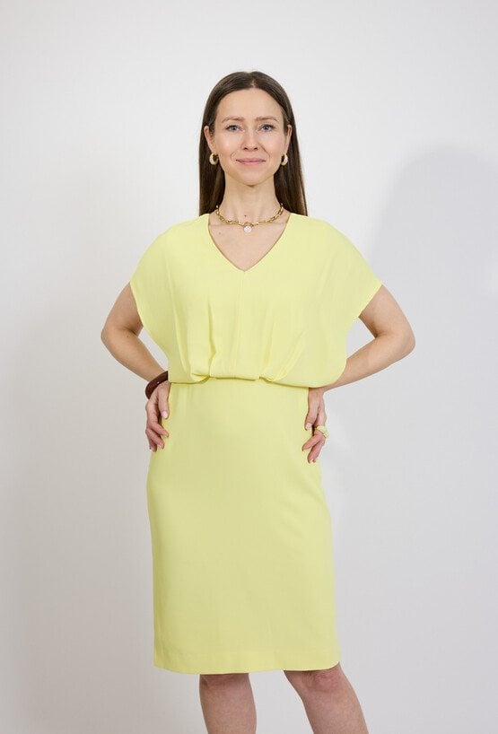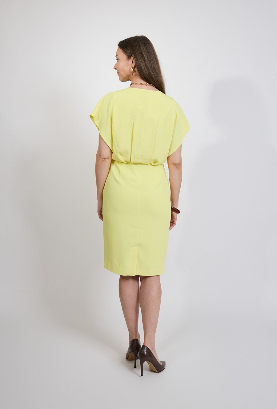 Elegancka sukienka damska w modnym pastelowym odcieniu to stylowa propozycja dla kobiet, które cenią klasyczną elegancję w nowoczesnym wydaniu. Model wyróżnia się lekką, zwiewną górą oraz dopasowanym dołem, który subtelnie podkreśla sylwetkę. Sukienka posiada kobiece wykończenie z dekoltem w kształcie litery V, które optycznie wydłuża szyję i nadaje stylizacji lekkości. Luźniejsza góra z krótkimi rękawami typu kimono zapewnia komfort noszenia i elegancki charakter. Dzięki dopasowanej spódnicowej części sukienka pięknie układa się na sylwetce i sprawdzi się zarówno w stylizacjach biznesowych, jak i podczas rodzinnych uroczystości czy letnich spotkań. Pastelowy kolor dodaje stylizacji świeżości i doskonale komponuje się z klasycznymi dodatkami. Modelka ma 172 cm wzrostu i nosi rozmiar 38/M