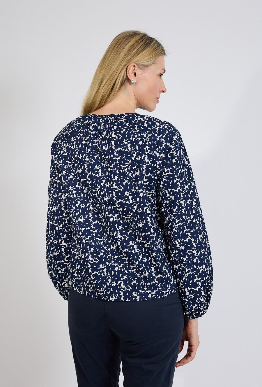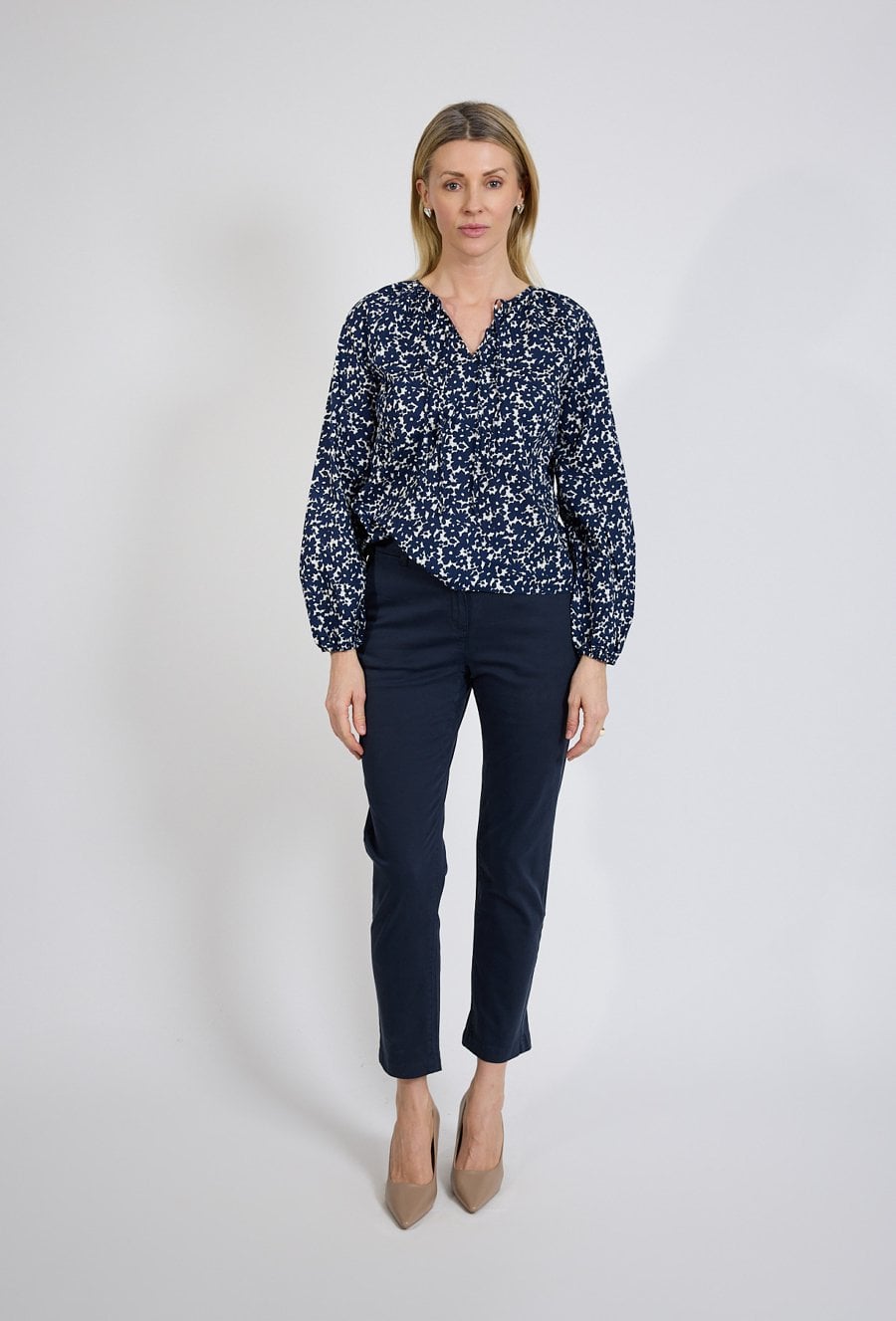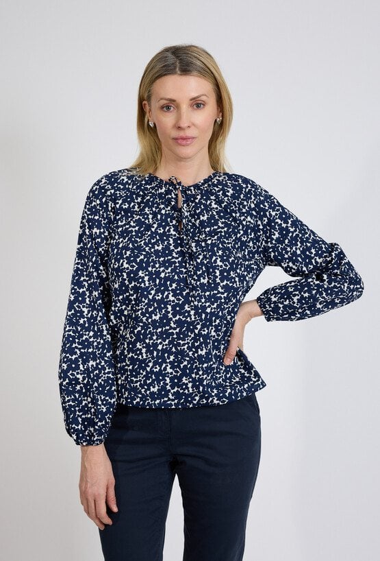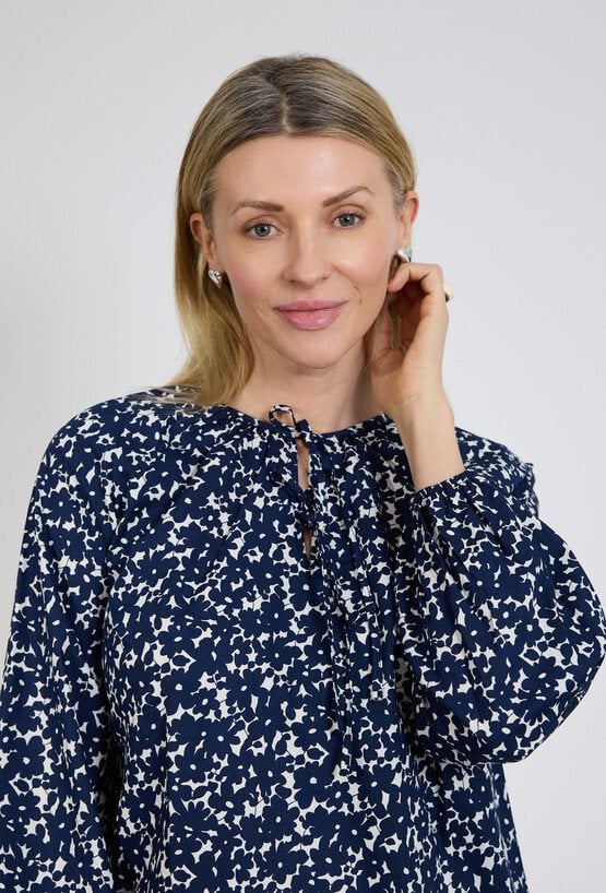 Bluzka damska w granatowo-biały print to uniwersalna propozycja łącząca elegancję z codziennym komfortem. Lekki materiał oraz swobodny fason sprawiają, że model doskonale układa się na sylwetce i zapewnia wygodę przez cały dzień. Dekolt z subtelnym wiązaniem dodaje kobiecego charakteru i pozwala dopasować stylizację do okazji – od biurowej po bardziej casualową. Długie rękawy zakończone mankietem podkreślają elegancki charakter bluzki, a ponadczasowy wzór sprawia, że model łatwo zestawić zarówno ze spodniami, jak i spódnicą. To idealny wybór do pracy, na spotkania oraz codzienne stylizacje. Modelka ma 179 cm wzrostu i nosi rozmiar 38/M