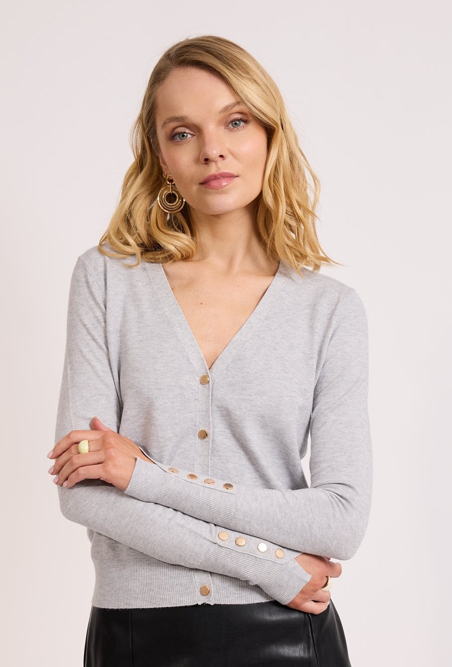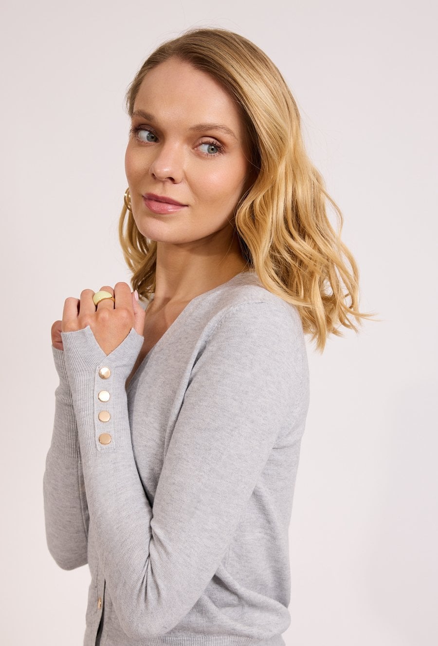 Fason lekko dopasowany, dekolt w serek i klasyczne zapięcie na guziki. Detalem, który robi różnicę, są złote guziki również przy rękawach – subtelny upgrade w stronę „premium look Modelka ma 178,5 cm wzrostu i nosi rozmiar 38/M