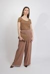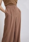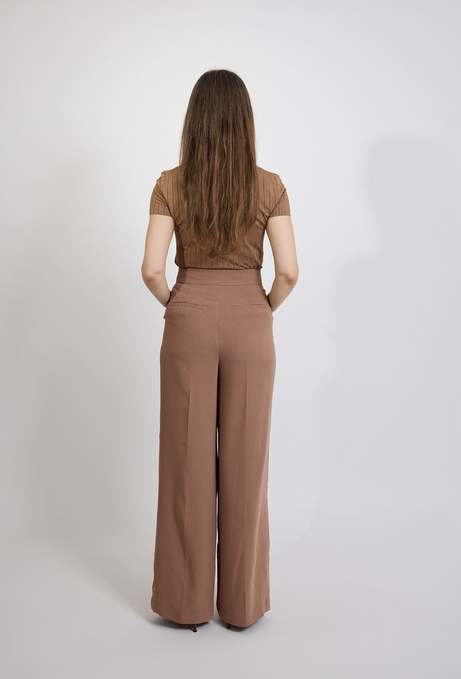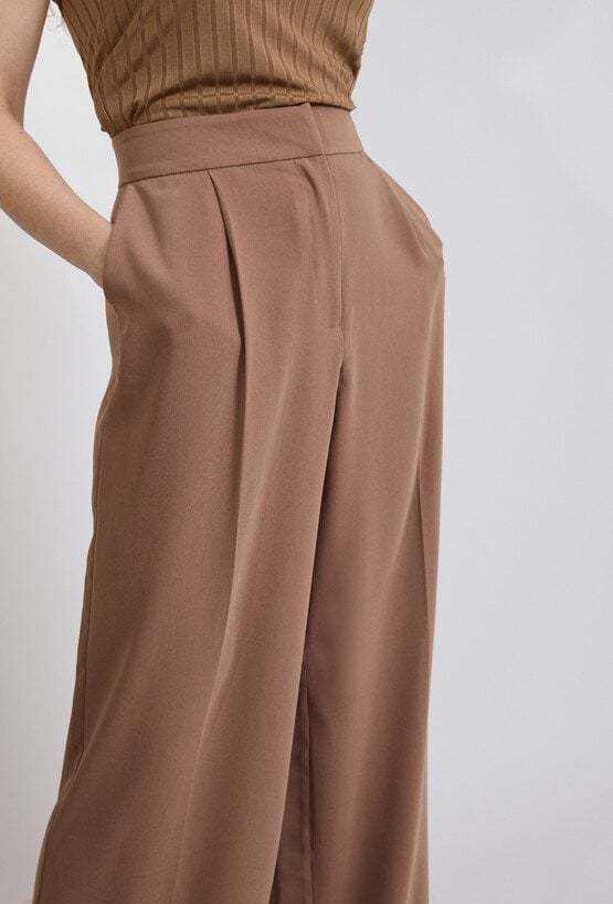 Eleganckie spodnie damskie w modnym kolorze camel to stylowa baza wielu kobiecych stylizacji. Model z wysokim stanem oraz szerokimi nogawkami pięknie podkreśla sylwetkę, zapewniając jednocześnie komfort noszenia. Klasyczny fason sprawia, że spodnie doskonale sprawdzą się w stylizacjach biznesowych, ale również w codziennych zestawach. Świetnie komponują się z koszulą, swetrem lub elegancką marynarką. To ponadczasowy element garderoby, który łączy elegancję z nowoczesnym stylem. Modelka ma 172 cm wzrostu i nosi rozmiar 38/M