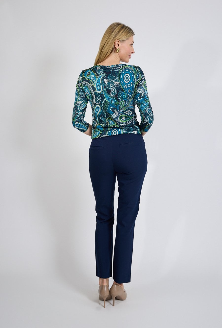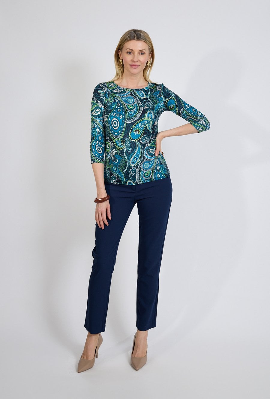 Granatowe spodnie damskie to klasyczna propozycja, która doskonale sprawdzi się w garderobie kapsułowej. Prosty, dopasowany fason podkreśla sylwetkę, a elegancki odcień granatu nadaje stylizacji profesjonalnego charakteru. Model został zaprojektowany z myślą o komforcie noszenia przez cały dzień. Gładki materiał dobrze układa się na sylwetce i zapewnia swobodę ruchów. Spodnie świetnie komponują się zarówno z koszulą i marynarką do biura, jak i z lekką bluzką lub swetrem na mniej formalne okazje. Modelka ma 179 cm wzrostu i nosi rozmiar 38/M