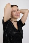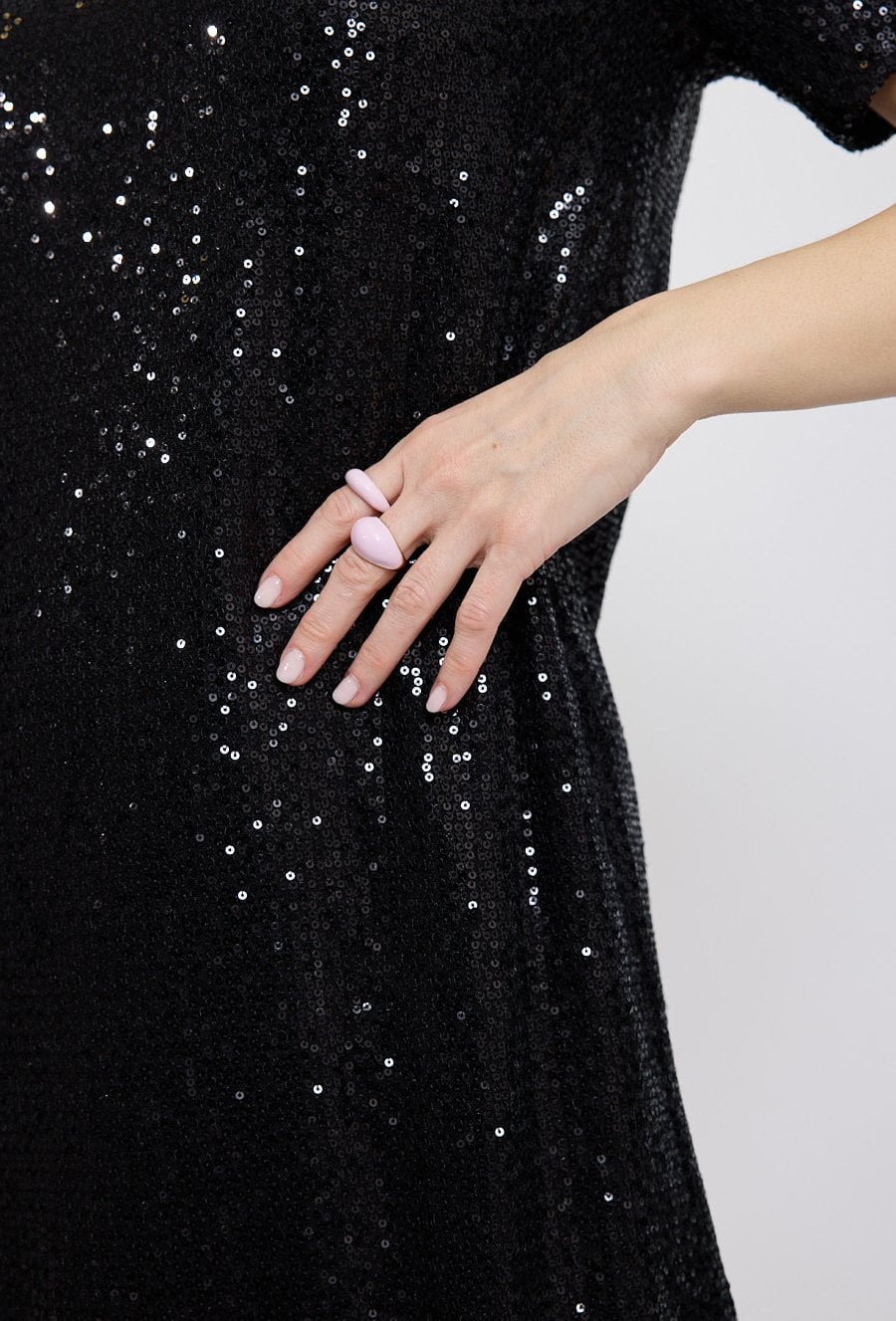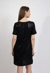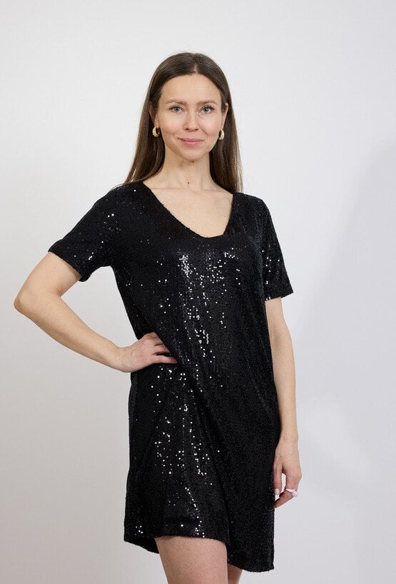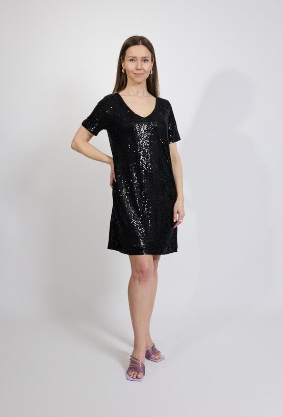 Czarna sukienka cekinowa to idealna propozycja na wieczorne wyjścia i wyjątkowe okazje. Całość pokryta błyszczącymi cekinami pięknie odbija światło, nadając stylizacji efektowny i elegancki charakter. Luźniejszy fason zapewnia komfort noszenia oraz swobodę ruchów, a krótki rękaw i dekolt w kształcie litery V podkreślają kobiecy styl modelu. Minimalistyczny krój sprawia, że sukienka doskonale prezentuje się zarówno z eleganckimi szpilkami, jak i bardziej nowoczesnymi dodatkami. To model, który świetnie sprawdzi się na przyjęciach, weselach, imprezach oraz w stylizacjach wieczorowych. Modelka ma 172 cm wzrostu i nosi rozmiar 38/M