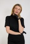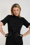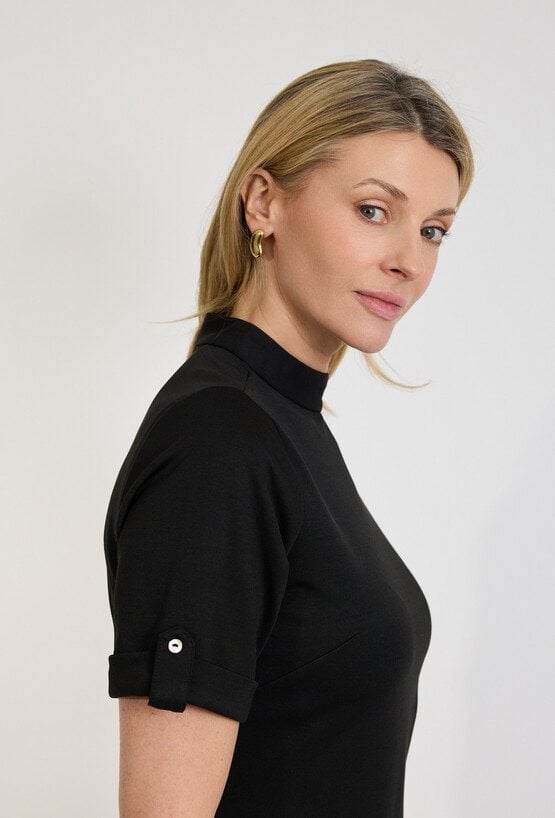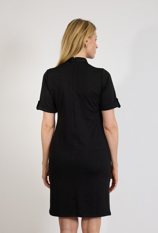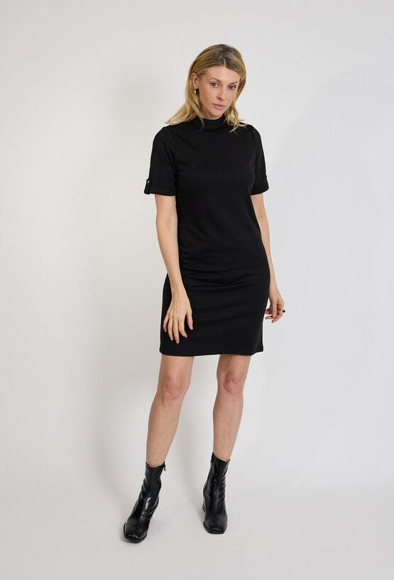 Klasyczna czarna sukienka damska o dopasowanym fasonie podkreślającym sylwetkę. Minimalistyczny design sprawia, że model jest niezwykle uniwersalny. Doskonała zarówno na spotkania biznesowe, jak i wieczorne wyjścia. Modelka ma 179 cm wzrostu i nosi rozmiar 38/M