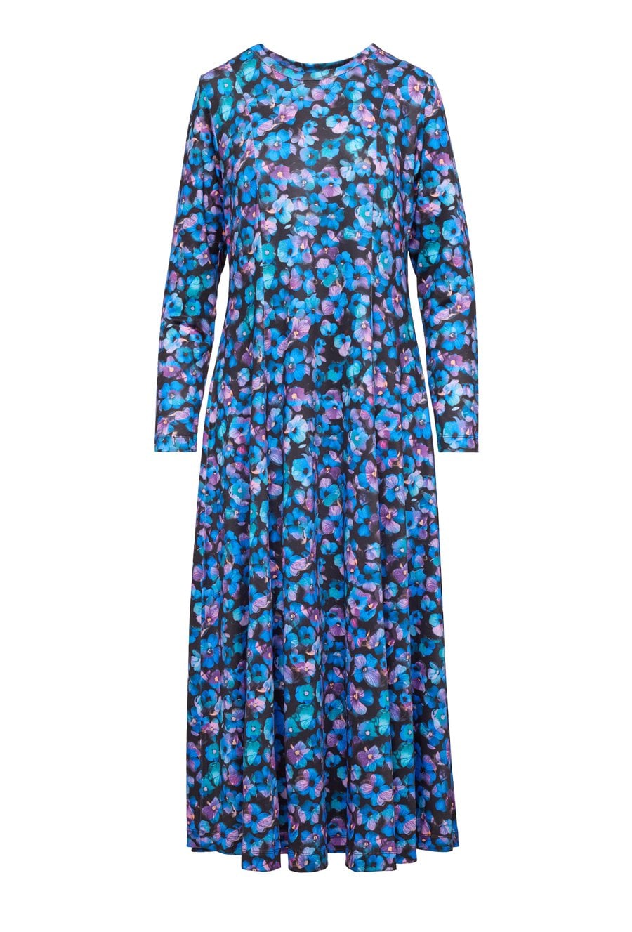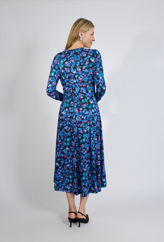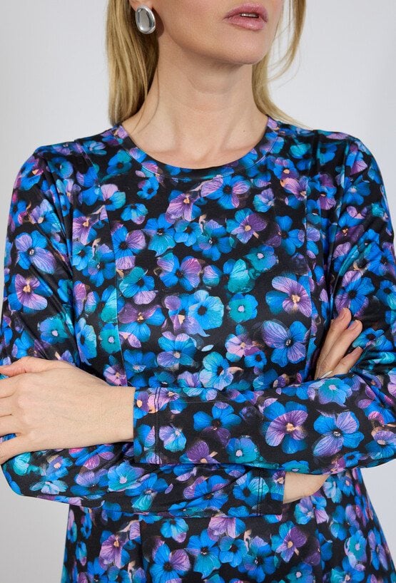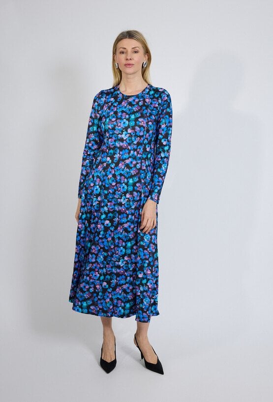 Długa kwiatowa sukienka to idealne połączenie kobiecości i wygody. Uszyta z lekkiej tkaniny, zachwyca rozszerzanym ku dołowi fasonem, który pięknie układa się w ruchu. Posiada długie rękawy oraz dekolt łódka, co dodaje jej subtelnej elegancji. Zapinana z tyłu na dyskretny zamek, doskonale podkreśla sylwetkę i zapewnia komfort noszenia. To ponadczasowy model, który sprawdzi się zarówno na co dzień, jak i podczas wyjątkowych okazji.