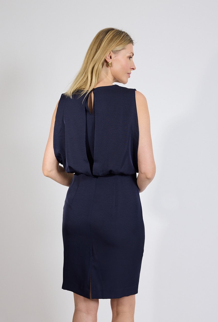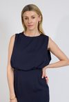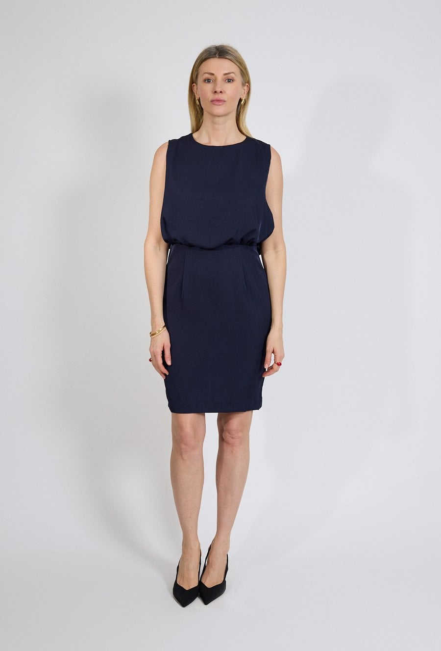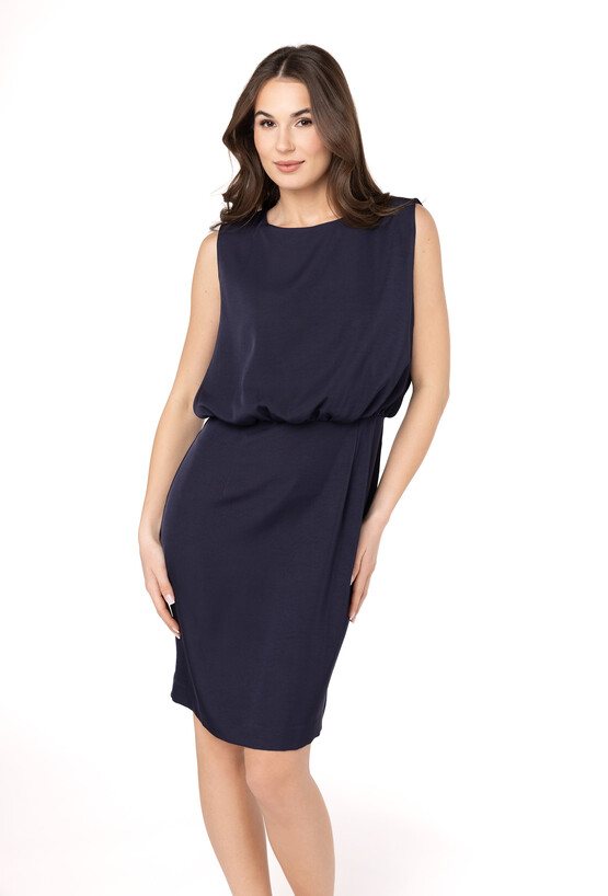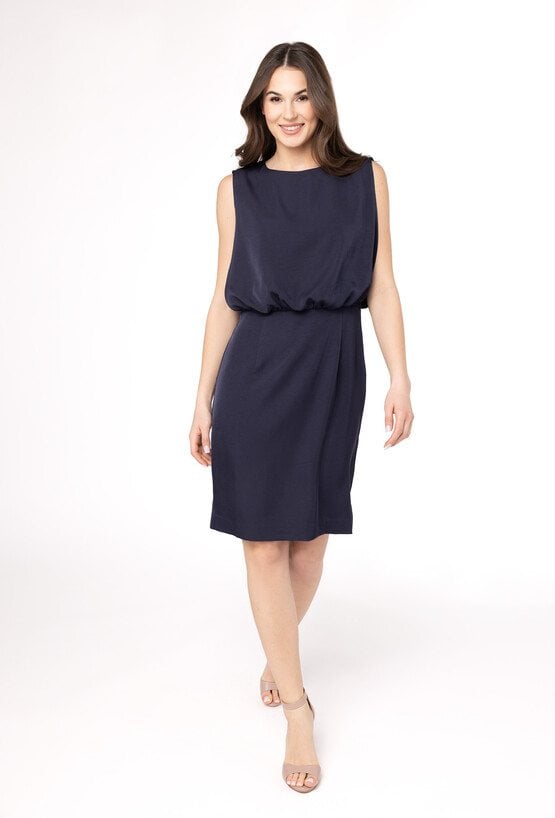 Klasyczna granatowa sukienka bez rękawów to bezpieczna inwestycja w garderobie kapsułowej. Prosty, dopracowany krój delikatnie podkreśla sylwetkę, a elastyczne marszczenie w talii zapewnia komfort noszenia przez cały dzień. Długość do kolan sprawia, że model doskonale odnajduje się zarówno w środowisku biznesowym, jak i podczas mniej formalnych okazji.