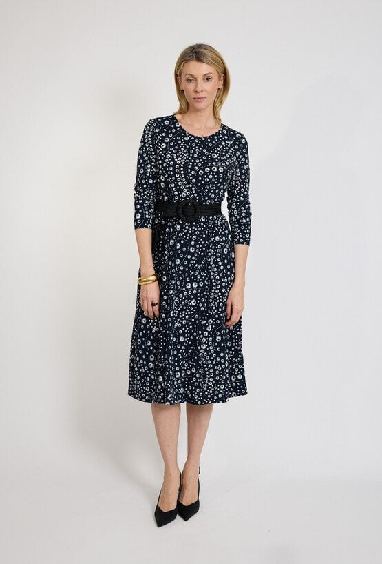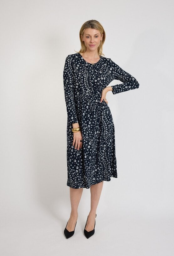 Granatowa sukienka damska we wzór to elegancka propozycja dla kobiet ceniących klasykę w nowoczesnym wydaniu. Model wyróżnia się subtelnym printem, kontrastowym kołnierzykiem oraz prostym, lekko rozkloszowanym fasonem, który pięknie układa się na sylwetce i zapewnia swobodę ruchów.