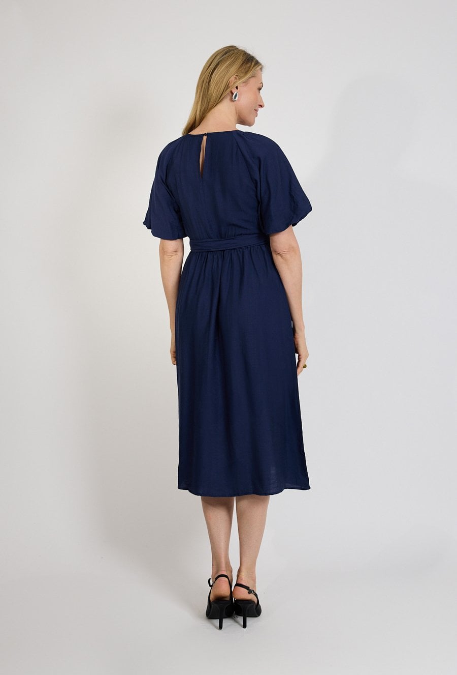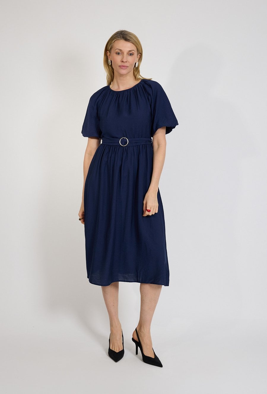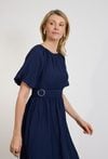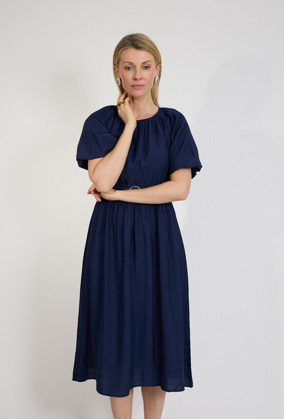 Granatowa sukienka midi z paskiem i krótkim rękawem
