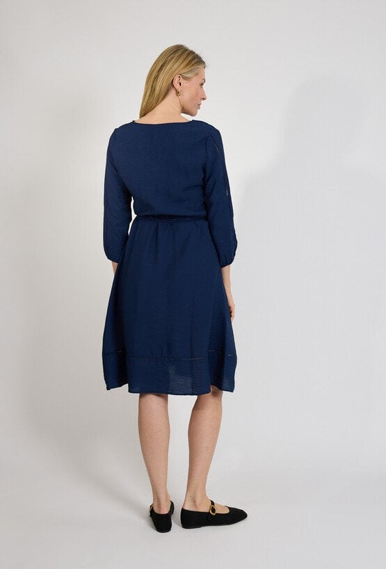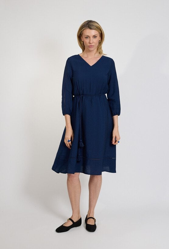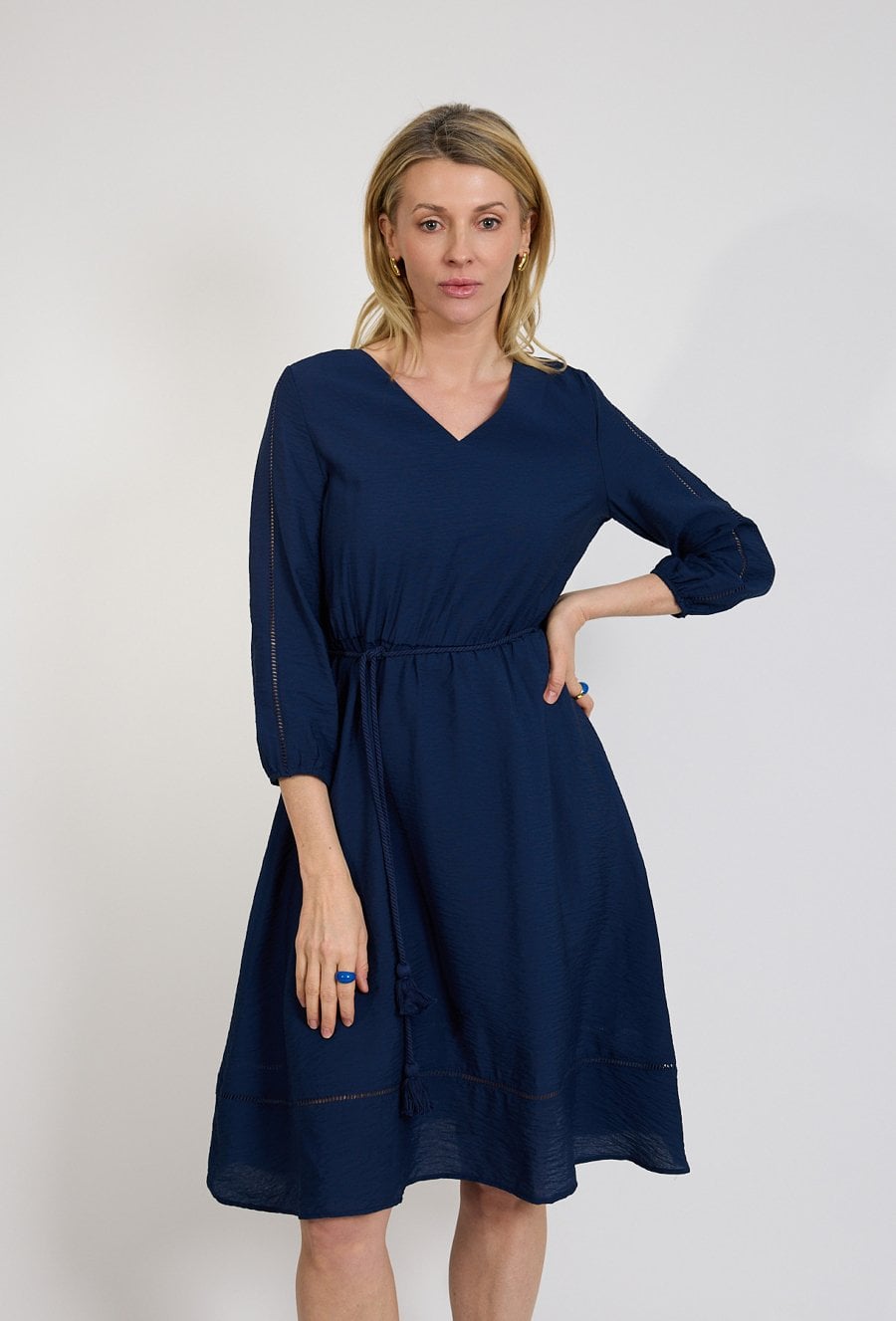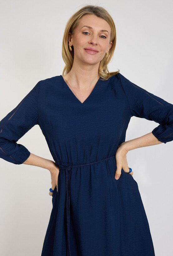 Granatowa sukienka midi z wiązaniem w talii i rękawem 3/4