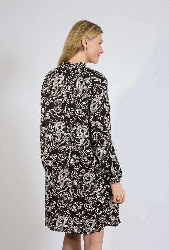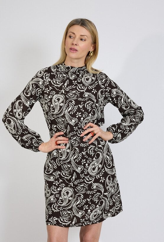Brązowa sukienka w klasyczny wzór paisley to elegancka propozycja dla kobiet ceniących ponadczasowy styl i komfort noszenia. Luźniejszy fason delikatnie układa się na sylwetce, zapewniając swobodę ruchów i wygodę przez cały dzień.