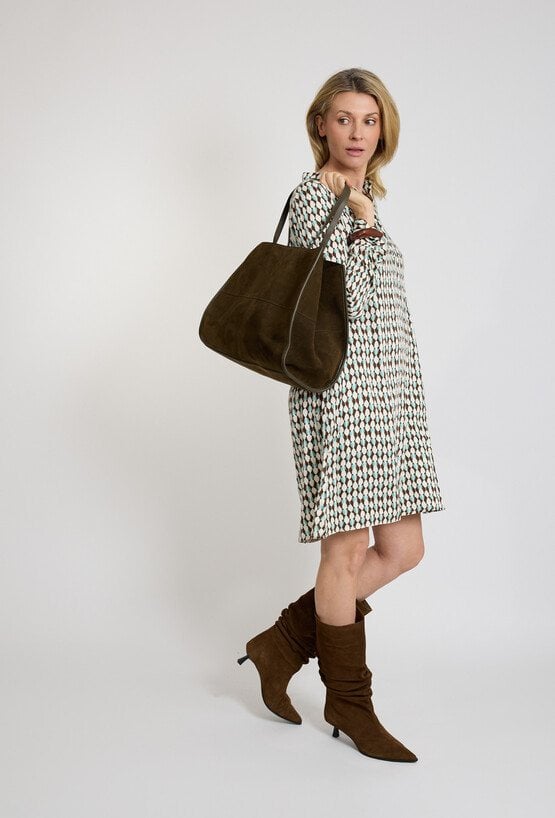 Sukienka damska w geometryczny wzór to połączenie ponadczasowej elegancji z nowoczesnym designem. Model wyróżnia się subtelnym kołnierzykiem oraz prostym fasonem, który pięknie układa się na sylwetce i zapewnia komfort noszenia przez cały dzień. Modelka ma 179 cm wzrostu i nosi rozmiar 38/M