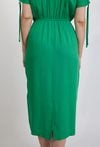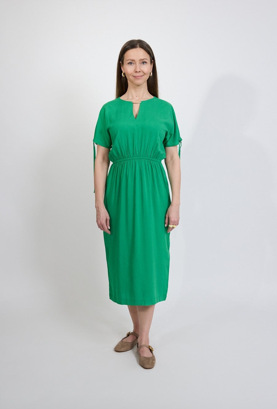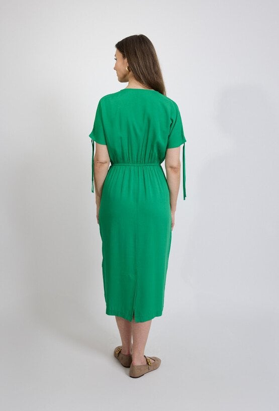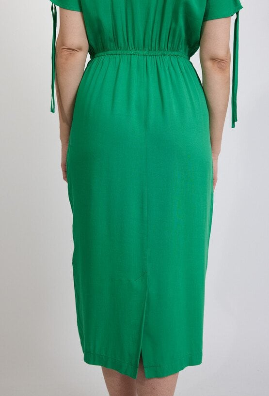 Stylowa sukienka damska w intensywnym zielonym kolorze to elegancka i uniwersalna propozycja na wiele okazji. Prosty, kobiecy fason pięknie podkreśla sylwetkę, a delikatnie zaznaczona talia nadaje całości lekkości. Model posiada krótki rękaw oraz subtelny dekolt z ozdobnym wycięciem w kształcie łezki, który dodaje stylizacji elegancji. Elastyczne marszczenie w talii zapewnia komfort noszenia oraz dopasowanie do sylwetki. Długość midi sprawia, że sukienka doskonale sprawdzi się zarówno w codziennych stylizacjach, jak i podczas spotkań, uroczystości czy pracy. Modelka ma 172 cm wzrostu i nosi rozmiar 38/M