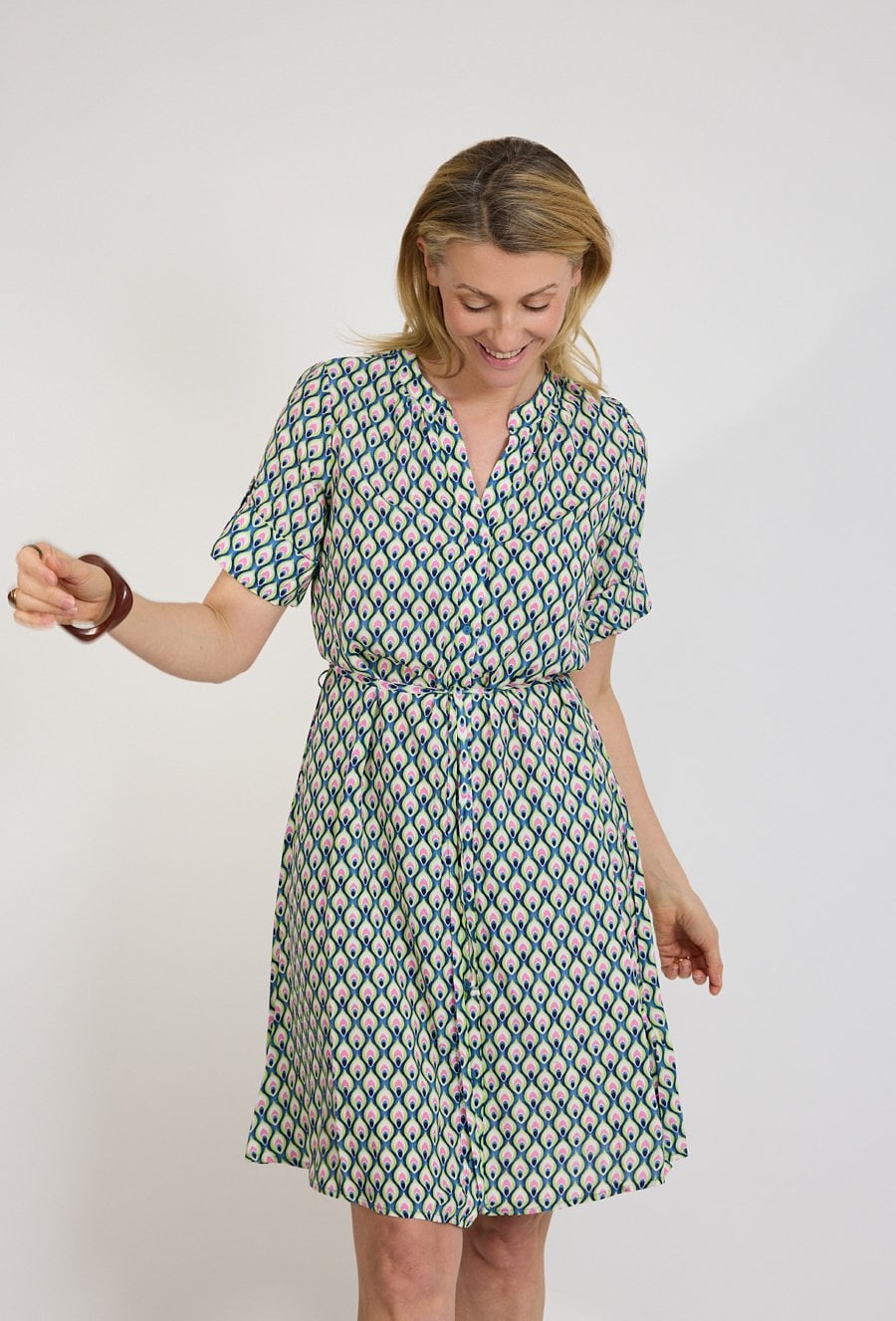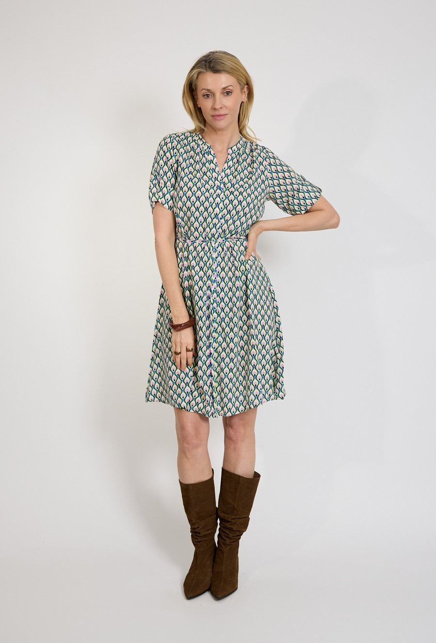 Sukienka mini we wzór geometryczny to stylowa propozycja dla kobiet, które lubią modę łączącą wygodę z wyrazistym charakterem. Oryginalny print w odcieniach zieleni, granatu i różu nadaje stylizacji świeżości oraz nowoczesnego wyglądu, jednocześnie pozostając elegancki i ponadczasowy. Modelka ma 179 cm wzrostu i nosi rozmiar 38/M