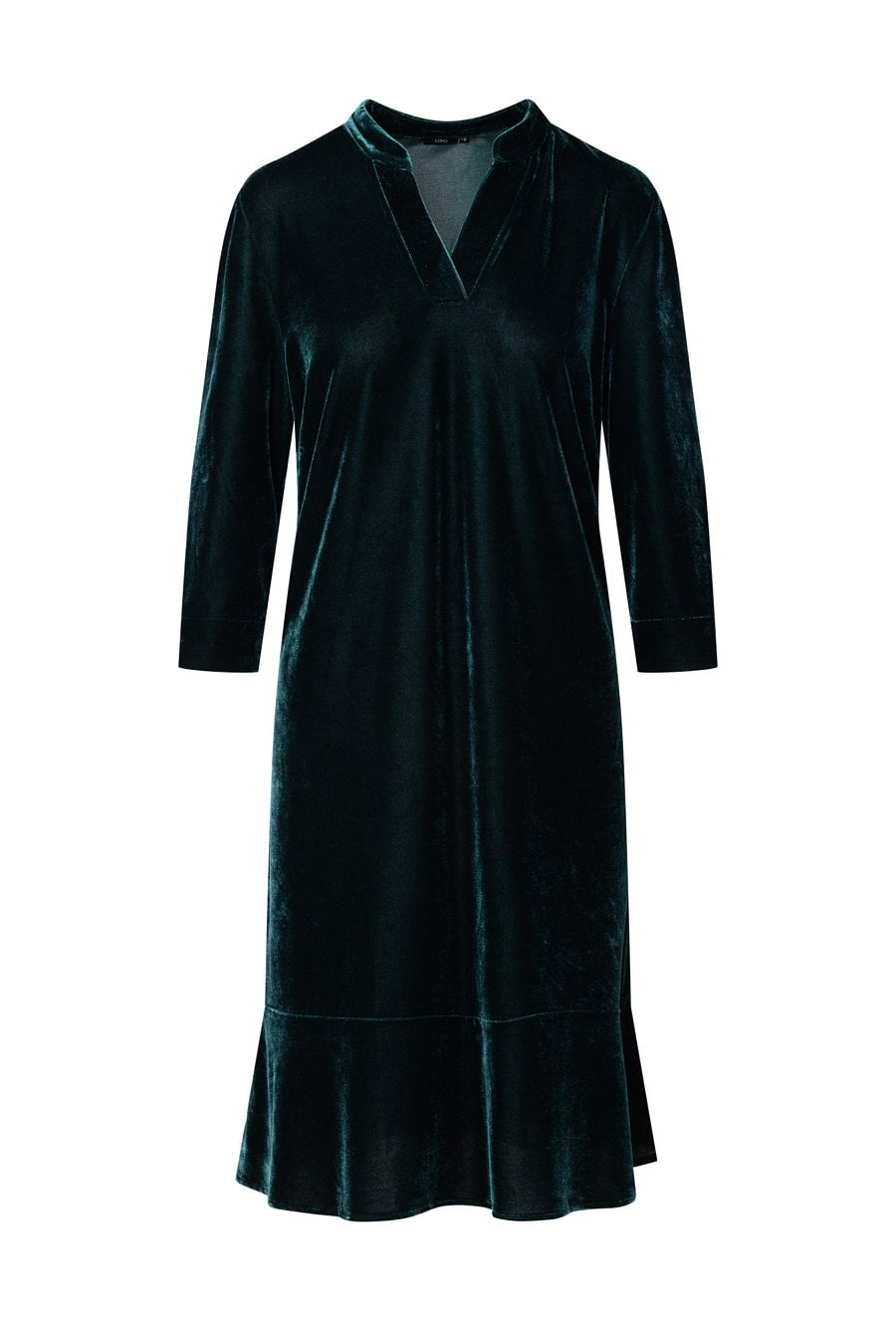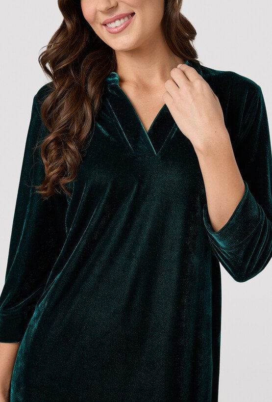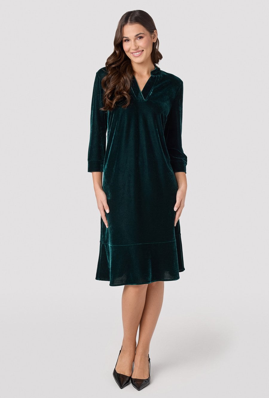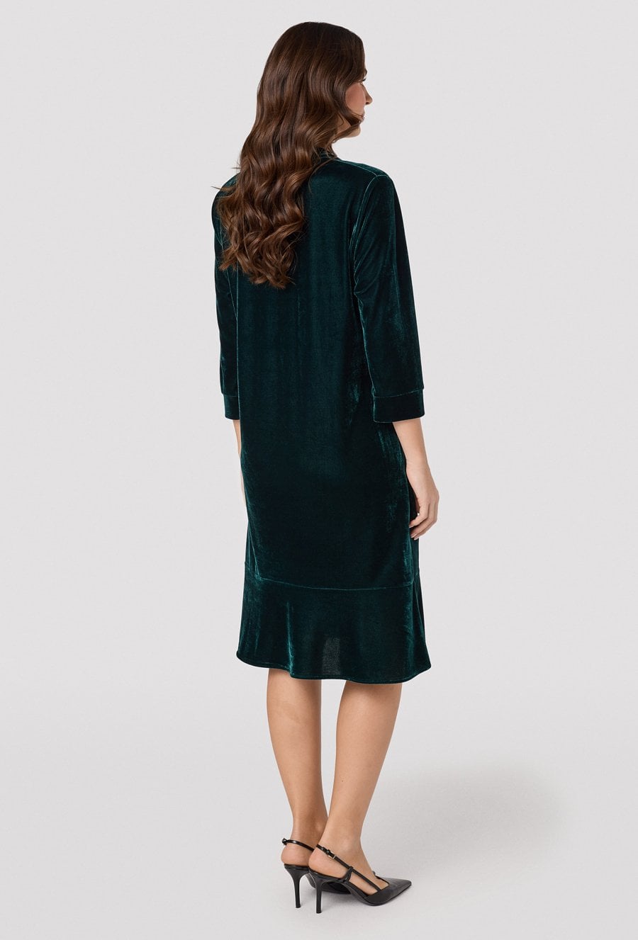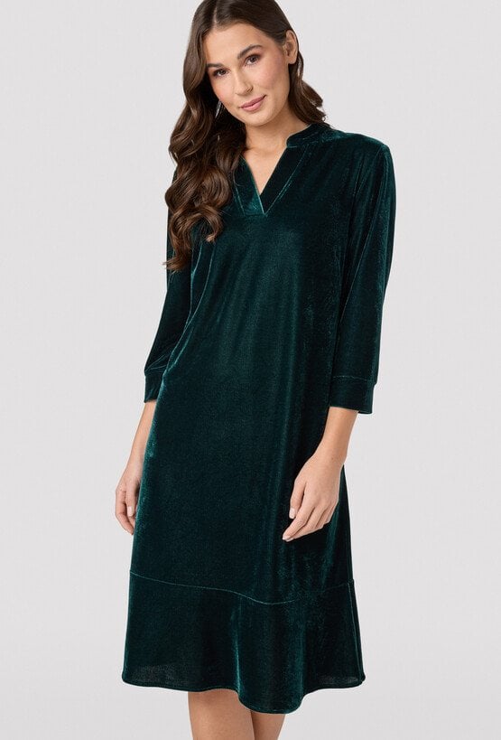 Stylowa sukienka damska wykonana z miękkiego, aksamitnego weluru, który subtelnie odbija światło i nadaje całości luksusowego charakteru. Klasyczny fason o długości midi delikatnie opływa sylwetkę, zapewniając komfort i elegancki wygląd bez wysiłku.Dekolt w kształcie litery V optycznie wysmukla szyję i górną część sylwetki, a rękawy 3/4 dodają lekkości i uniwersalności. Delikatne przeszycie przy dole wprowadza subtelny detal, który przełamuje prostą formę i podkreśla jakość wykończenia.