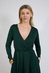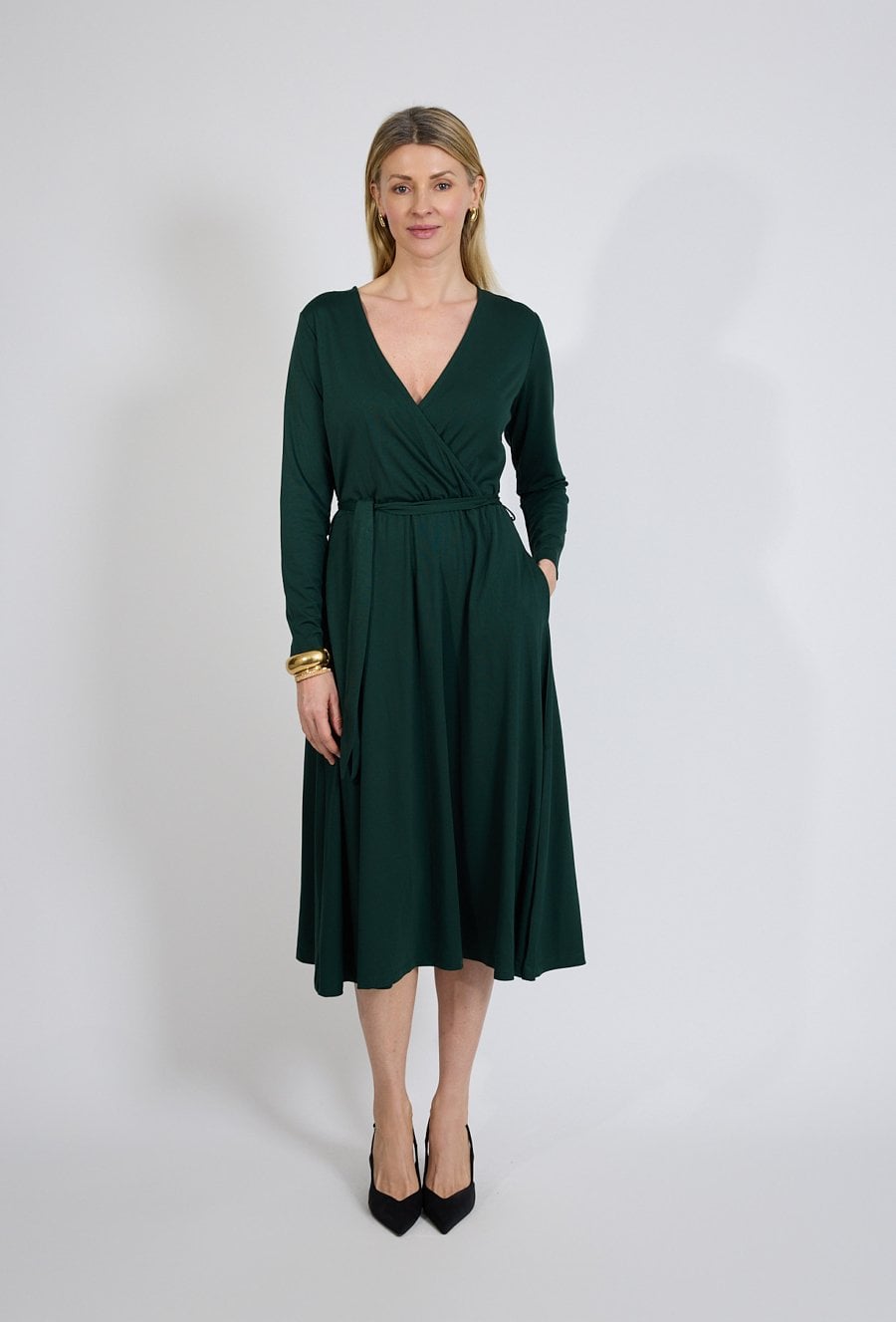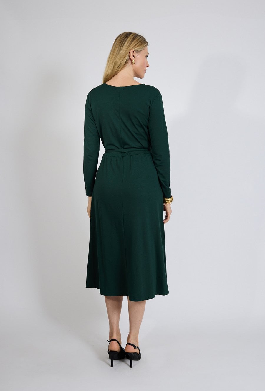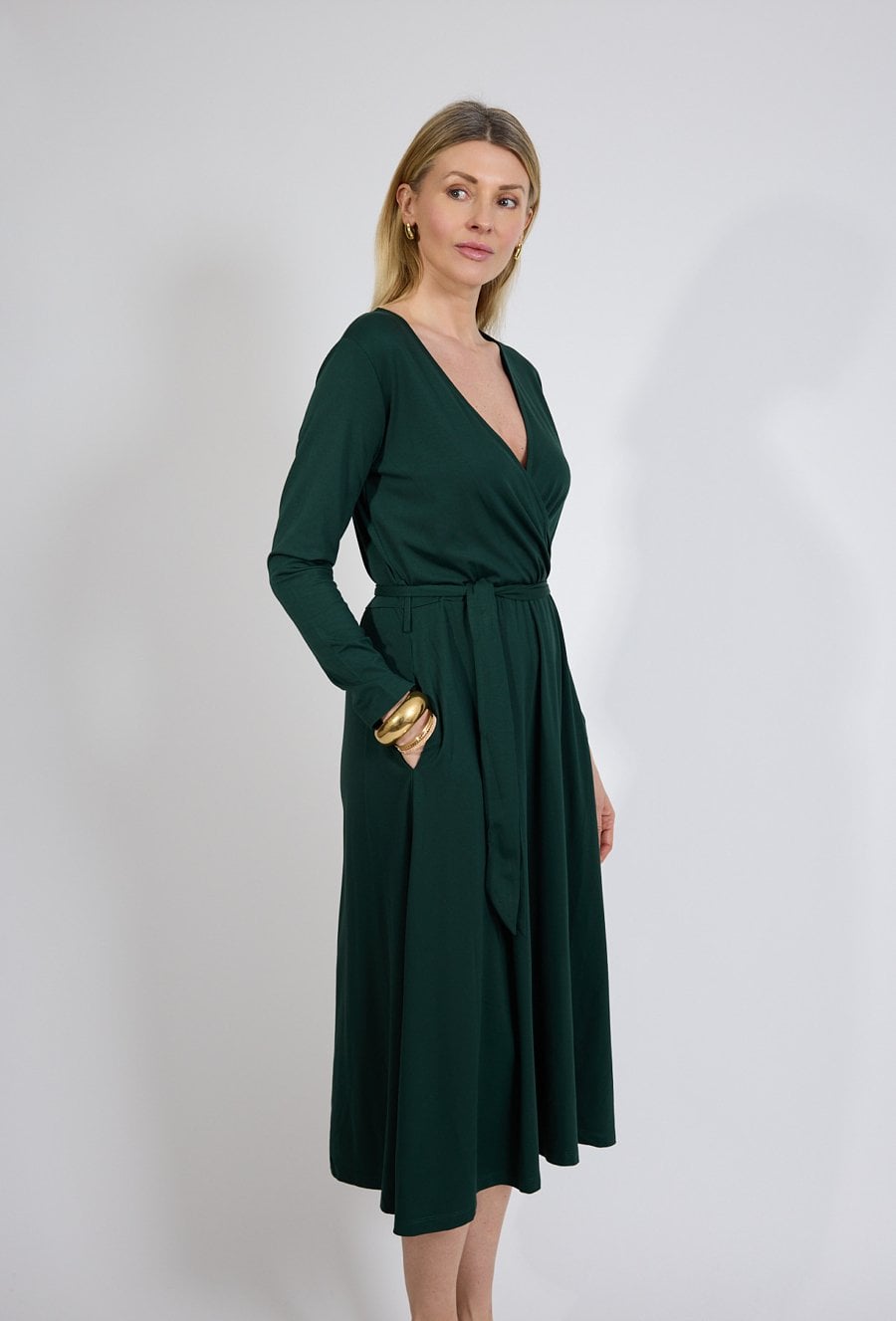 Ta zielona sukienka midi to klasyka, która od lat dowozi wynik. Kopertowy dekolt w kształcie V optycznie wysmukla sylwetkę i podkreśla linię szyi, a wiązanie w talii robi dokładnie to, czego oczekuje klientka: modeluje proporcje bez uczucia skrępowania.