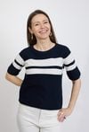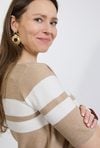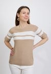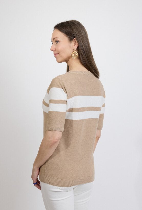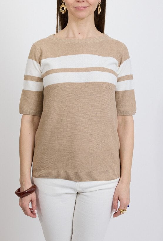 Elegancki sweter damski w ponadczasowym beżowym kolorze to stylowa propozycja dla kobiet, które cenią klasykę w nowoczesnym wydaniu. Model został urozmaicony kontrastowymi białymi paskami, które nadają mu świeżości i subtelnego, modowego charakteru. Sweter posiada krótki rękaw oraz klasyczny, okrągły dekolt, dzięki czemu jest wygodny i idealnie sprawdza się w cieplejsze dni. Delikatna dzianina zapewnia komfort noszenia, a prosty fason sprawia, że model świetnie układa się na sylwetce. To uniwersalny element garderoby, który z łatwością dopasujesz zarówno do eleganckich spodni, jak i casualowych jeansów czy spódnicy.