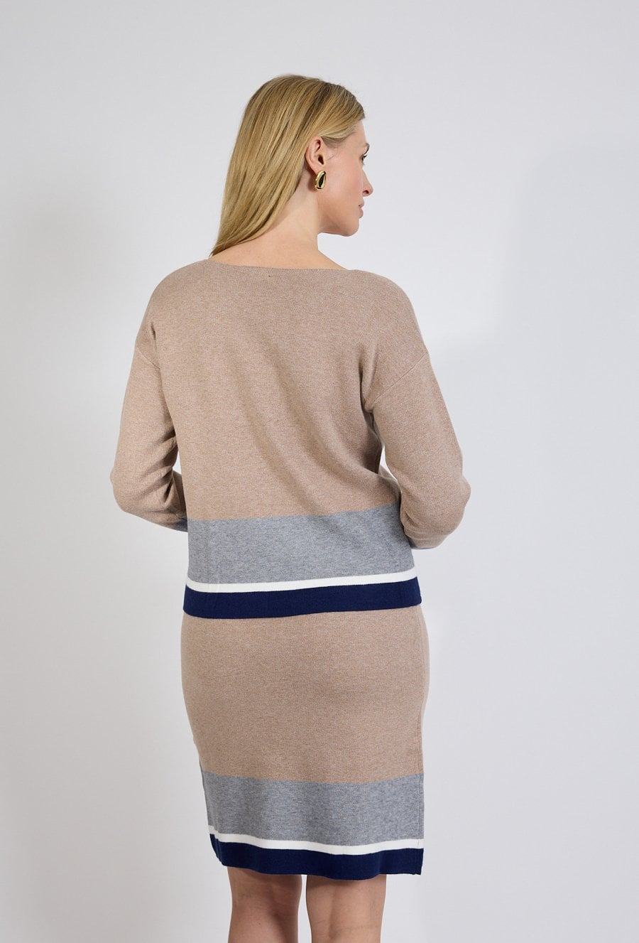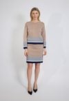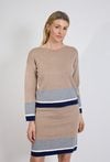 Beżowy sweter damski z kontrastowym wykończeniem to elegancka propozycja dla kobiet, które cenią klasykę w nowoczesnym wydaniu. Minimalistyczny fason został uzupełniony o stylowe detale w odcieniach granatu, bieli i szarości, które nadają całości wyrafinowanego charakteru. Miękka, przyjemna w dotyku dzianina zapewnia komfort noszenia przez cały dzień, a prosty krój sprawia, że sweter doskonale układa się na sylwetce. Kontrastowe mankiety oraz dół modelu przyciągają uwagę i podkreślają modowy charakter produktu, jednocześnie zachowując elegancję. Model świetnie sprawdzi się w stylizacjach do pracy, na spotkania oraz w codziennych zestawach smart casual. Można go łączyć zarówno ze spodniami materiałowymi, jak i spódnicami, tworząc spójne i ponadczasowe stylizacje.