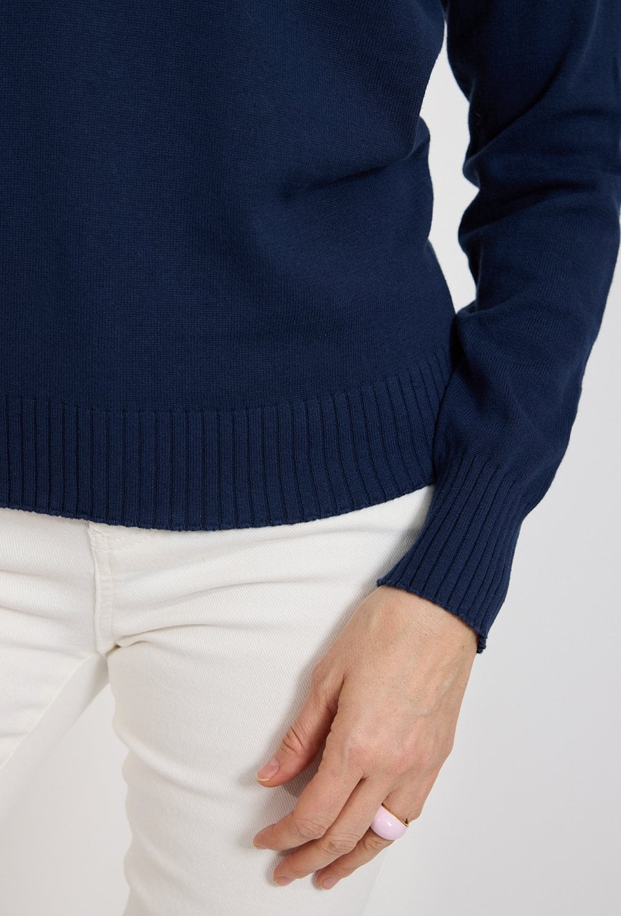 Granatowy sweter damski z dekoltem V to klasyczna propozycja dla kobiet ceniących elegancję i wygodę. Wykonany z miękkiej dzianiny zapewnia komfort noszenia, a dopasowany krój podkreśla sylwetkę. Doskonale sprawdzi się w stylizacjach biznesowych oraz casualowych. Modelka ma 179 cm wzrostu i nosi rozmiar 38/M