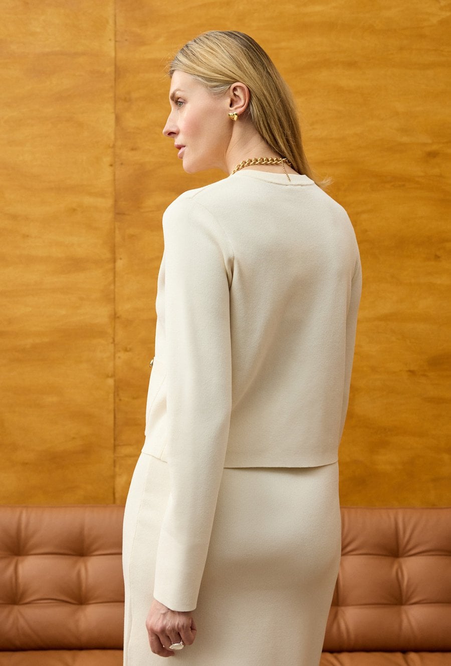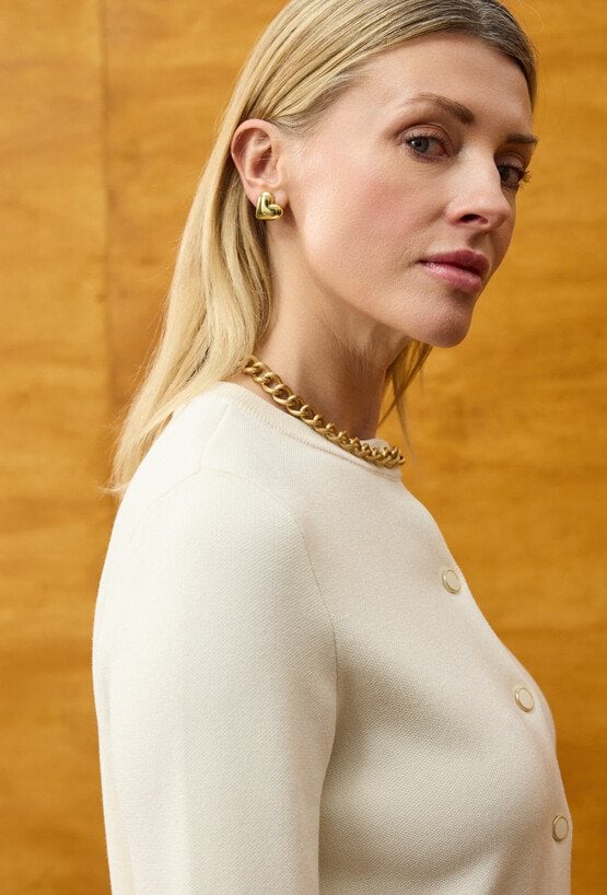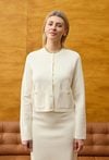 Kardigan damski o eleganckim charakterze to połączenie komfortu dzianiny z klasyką żakietu. Minimalistyczny fason sprawia, że model wygląda stylowo i ponadczasowo, a jednocześnie zapewnia wygodę przez cały dzień. Zapięcie na guziki oraz subtelne kieszenie z przodu nadają całości uporządkowanego, eleganckiego wyglądu. Miękka, elastyczna dzianina dobrze układa się na sylwetce i nie krępuje ruchów, dzięki czemu kardigan świetnie sprawdza się zarówno w pracy, jak i w codziennych stylizacjach. Neutralny beżowy kolor pozwala łatwo łączyć go z sukienkami, spódnicami i spodniami. W zestawie ze spódnicą tworzy elegancki komplet, a noszony osobno stanowi uniwersalny element garderoby kapsułowej. Komfort, styl i funkcjonalność w jednym. Modelka ma 179 cm wzrostu i nosi rozmiar 38/M
