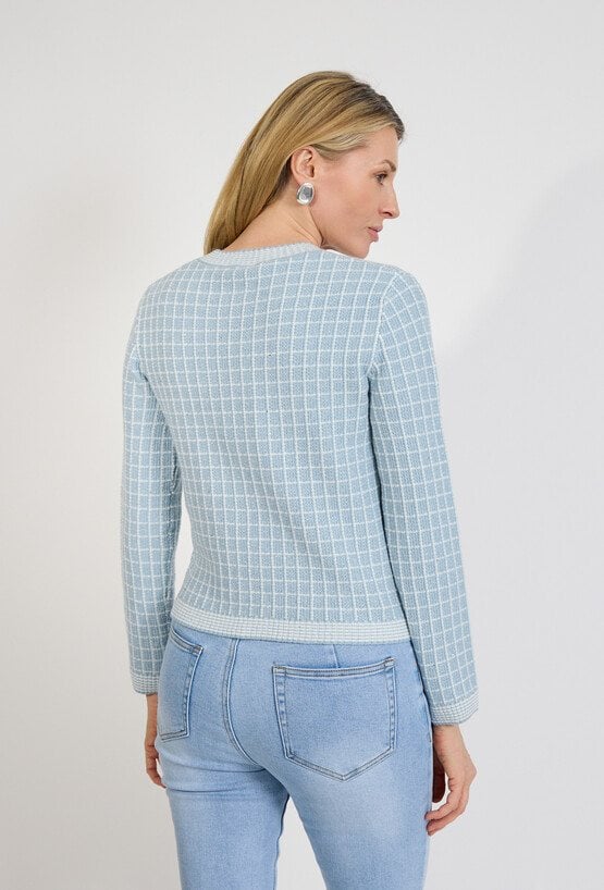 Niebieski kardigan damski w delikatną kratkę to elegancka propozycja dla kobiet, które cenią ponadczasowy styl i komfort noszenia. Subtelny wzór w kratkę nadaje modelowi lekkości i kobiecego charakteru, a pastelowy odcień niebieskiego wprowadza świeżość do stylizacji.