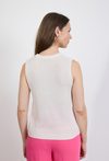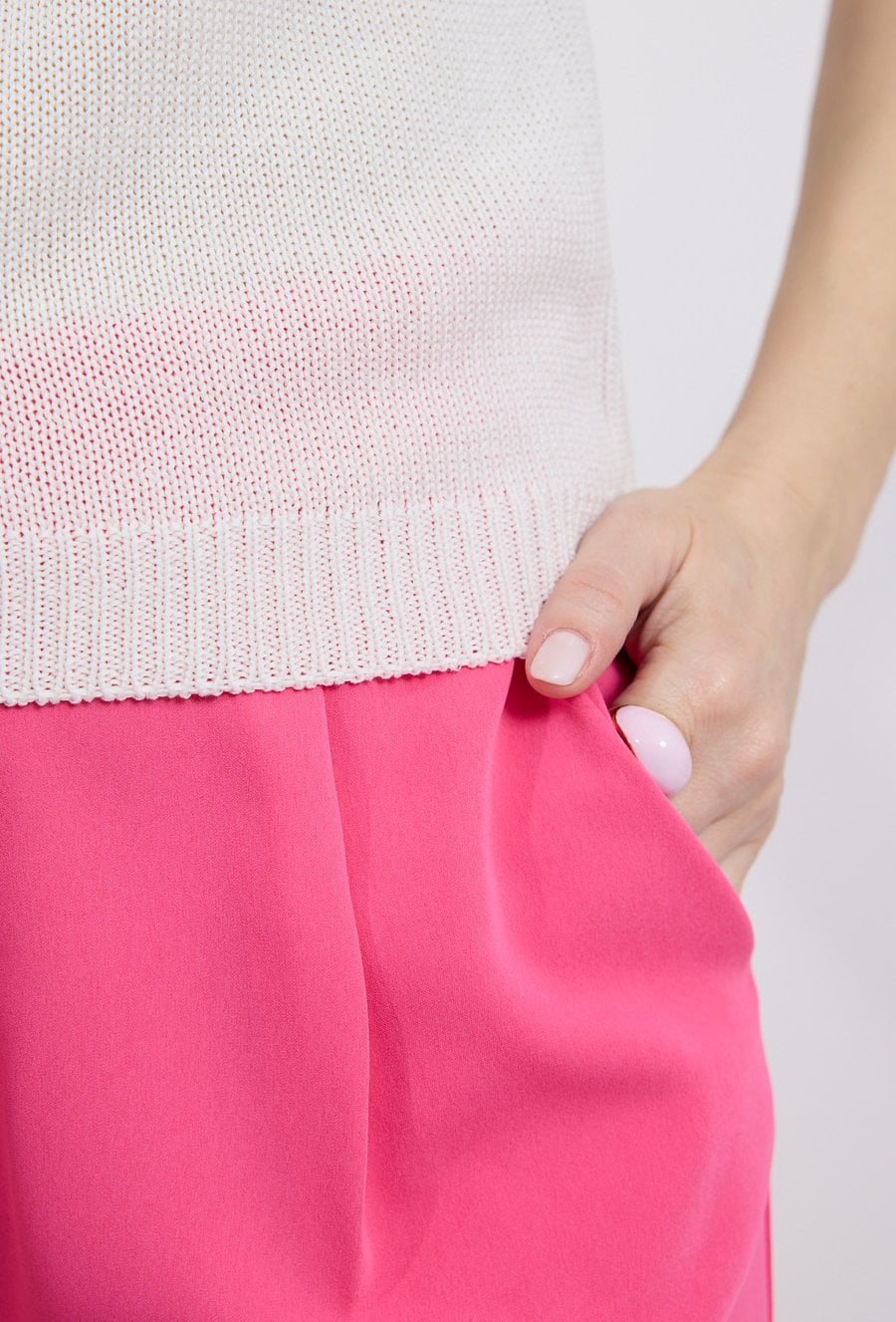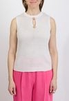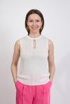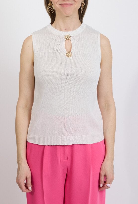 Elegancki sweter damski bez rękawów w kolorze ecru to ponadczasowy element garderoby, który doskonale sprawdzi się w wielu stylizacjach. Minimalistyczny fason został uzupełniony subtelnym wycięciem przy dekolcie z dekoracyjnym detalem, który nadaje całości wyjątkowego charakteru. Miękka dzianina zapewnia komfort noszenia, a dopasowany krój pięknie podkreśla sylwetkę. Sweter świetnie komponuje się zarówno z eleganckimi spodniami, jak i spódnicą, tworząc stylowy i kobiecy zestaw. To idealna propozycja do stylizacji smart casual oraz eleganckich stylizacji na co dzień. Modelka ma 172 cm wzrostu i nosi rozmiar 38/M