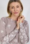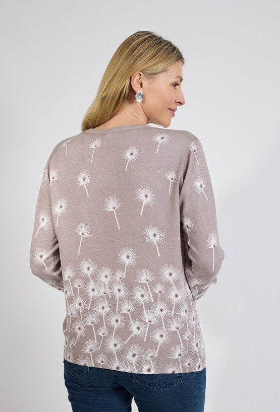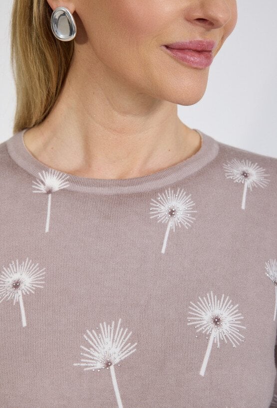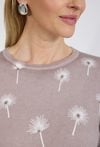Sweter damski QUIOSQUE w delikatnym odcieniu beżu z subtelnym motywem dmuchawców to propozycja dla kobiet ceniących elegancję w lekkiej, kobiecej odsłonie. Jasny wzór na tle stonowanej dzianiny dodaje stylizacji świeżości i sprawia, że model prezentuje się wyjątkowo, a jednocześnie ponadczasowo.