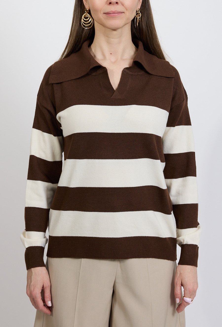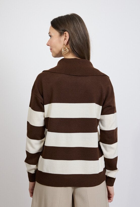 Sweter damski w szerokie paski to ponadczasowa propozycja do codziennych stylizacji. Połączenie głębokiego brązu z jasnym beżem nadaje modelowi eleganckiego, naturalnego charakteru. Fason z kołnierzem inspirowanym stylem polo wprowadza subtelną nutę sportowej elegancji. Miękka dzianina zapewnia komfort noszenia przez cały dzień, a klasyczny krój sprawia, że sweter świetnie komponuje się zarówno ze spodniami, jak i spódnicą. To doskonały wybór do stylizacji casual i smart casual. Modelka ma 172 cm wzrostu i nosi rozmiar 38/M