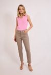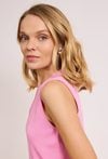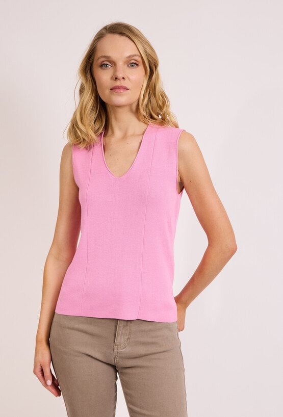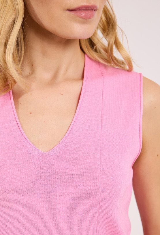 Różowy top dzianinowy bez rękawów to model, który działa jako baza, ale robi efekt dzięki kolorowi. Dopasowany krój podkreśla sylwetkę, a dekolt V optycznie wydłuża szyję i nadaje całości lekkości. Gładka dzianina sprawia, że top dobrze układa się na ciele i jest komfortowy w noszeniu nawet przez cały dzień. To idealny element do budowania stylizacji warstwowych albo noszenia solo w cieplejsze dni. Modelka ma 178,5 cm wzrostu i nosi rozmiar 38/M