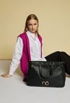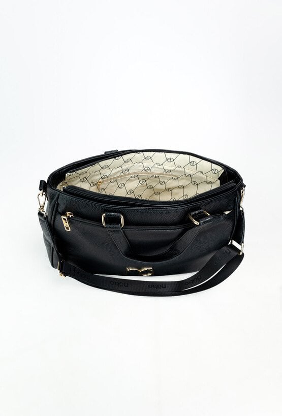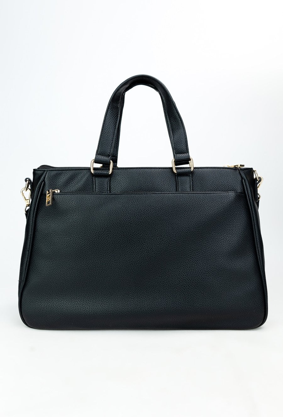 Duża torba damska z kolekcji biurowej, jednokomorowa, z dodatkowymi kieszonkami, w tym specjalną przegródką na laptopa. Torba zawieszona na rączkach, a w zestawie znajduje się także regulowany pasek. Z przodu i z tyłu torby znajdują się dodatkowe kieszonki zapinane na suwak, zapewniające wygodny dostęp do drobnych rzeczy. Torbę należy przechowywać w dołączonym woreczku. Wymiary: 40 cm x 28 cm x 9 cm.