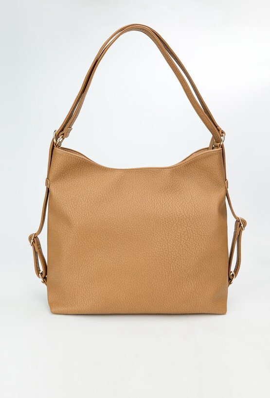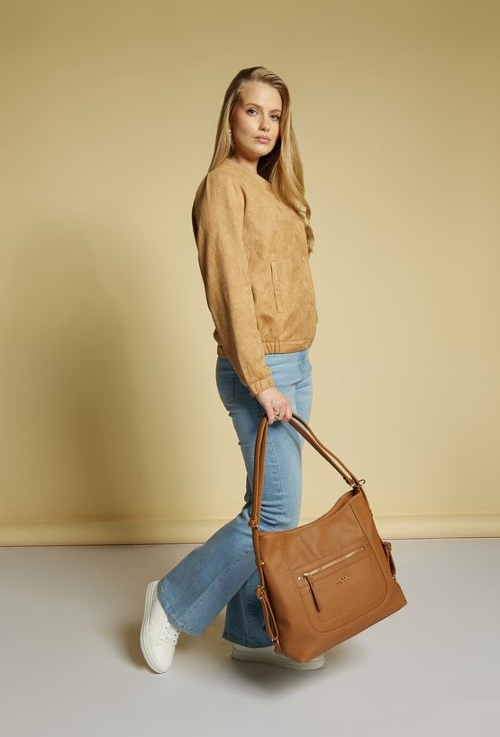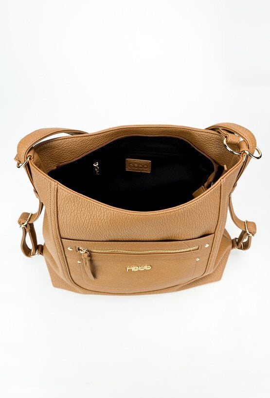 Duża torba damska typu worek, łącząca przestronność z wygodą. Jednokomorowa, wyposażona w dodatkową kieszonkę wewnętrzną oraz praktyczną kieszeń z przodu. Zapinana na suwak, zapewniający bezpieczeństwo zawartości. Zawieszona na regulowanej rączce, dzięki czemu można dopasować jej długość do własnych potrzeb. Torbę należy przechowywać w dołączonym woreczku. Wymiary: 37 cm x 31 cm x 8 cm.