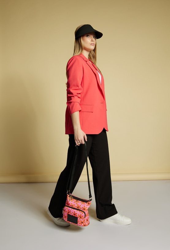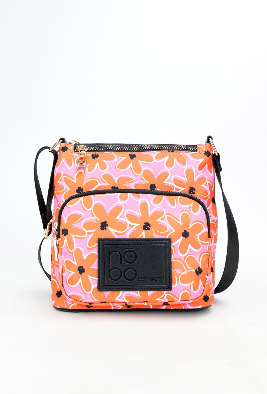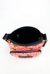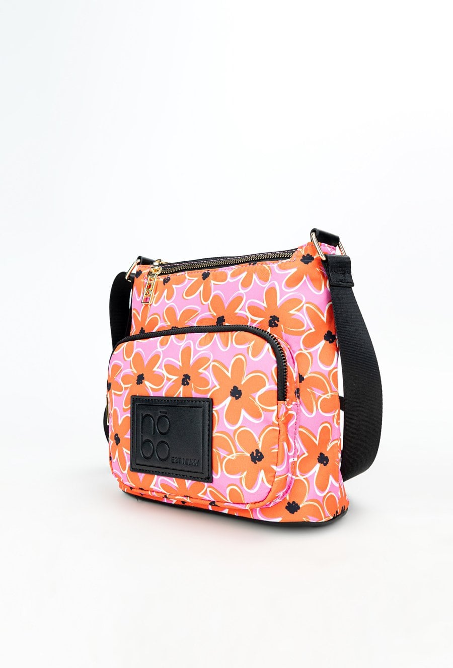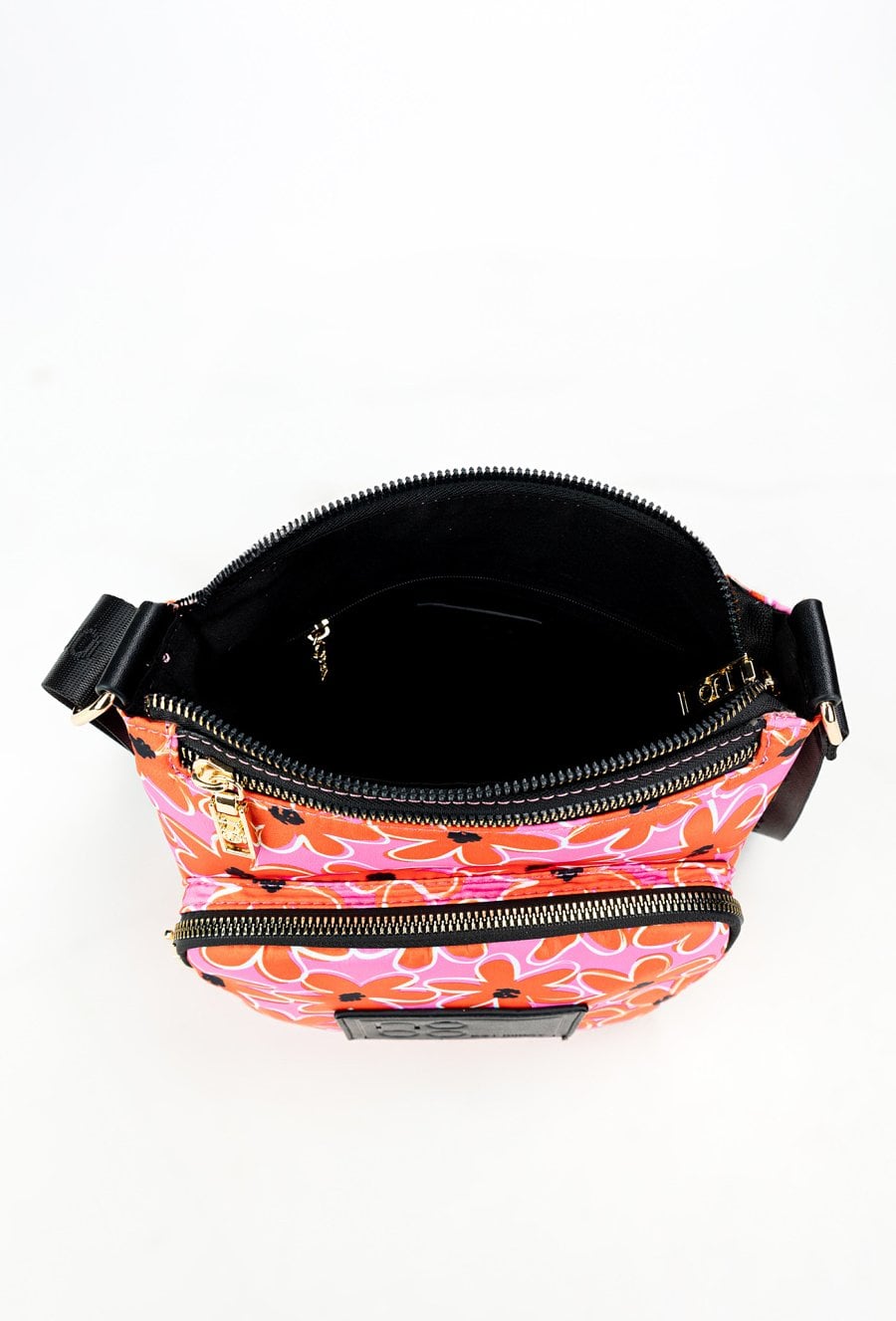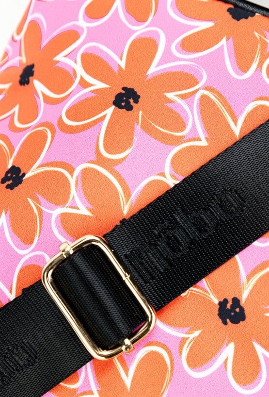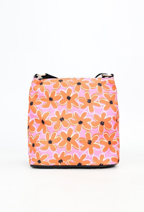 Tekstylna torebka damska z wzorzystym, kwiatowym wzorem. Torba jednokomorowa, wyposażona w praktyczne kieszonki wewnętrzne, idealne na drobiazgi. Z przodu znajdują się dwie kieszonki zapinane na suwak, zapewniające szybki dostęp do najpotrzebniejszych rzeczy. Dzięki swojemu stylowemu designowi, torba doskonale dopełni wiosenne stylizacje. Torbę należy przechowywać w dołączonym woreczku. Wymiary: 24 cm x 22 cm x 7 cm.