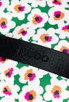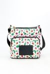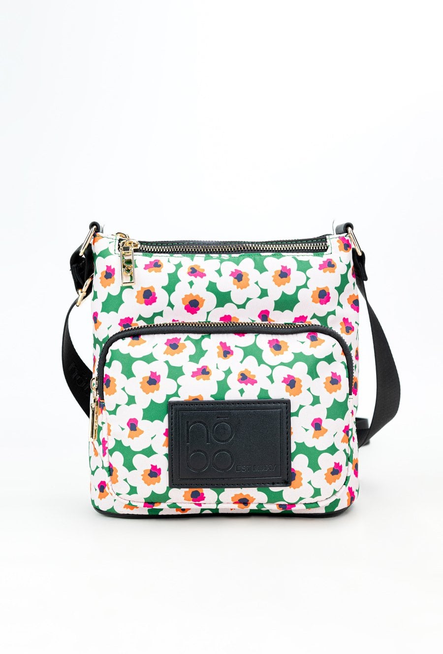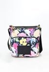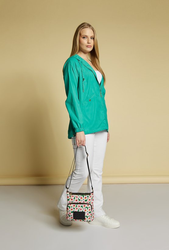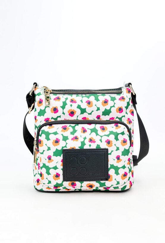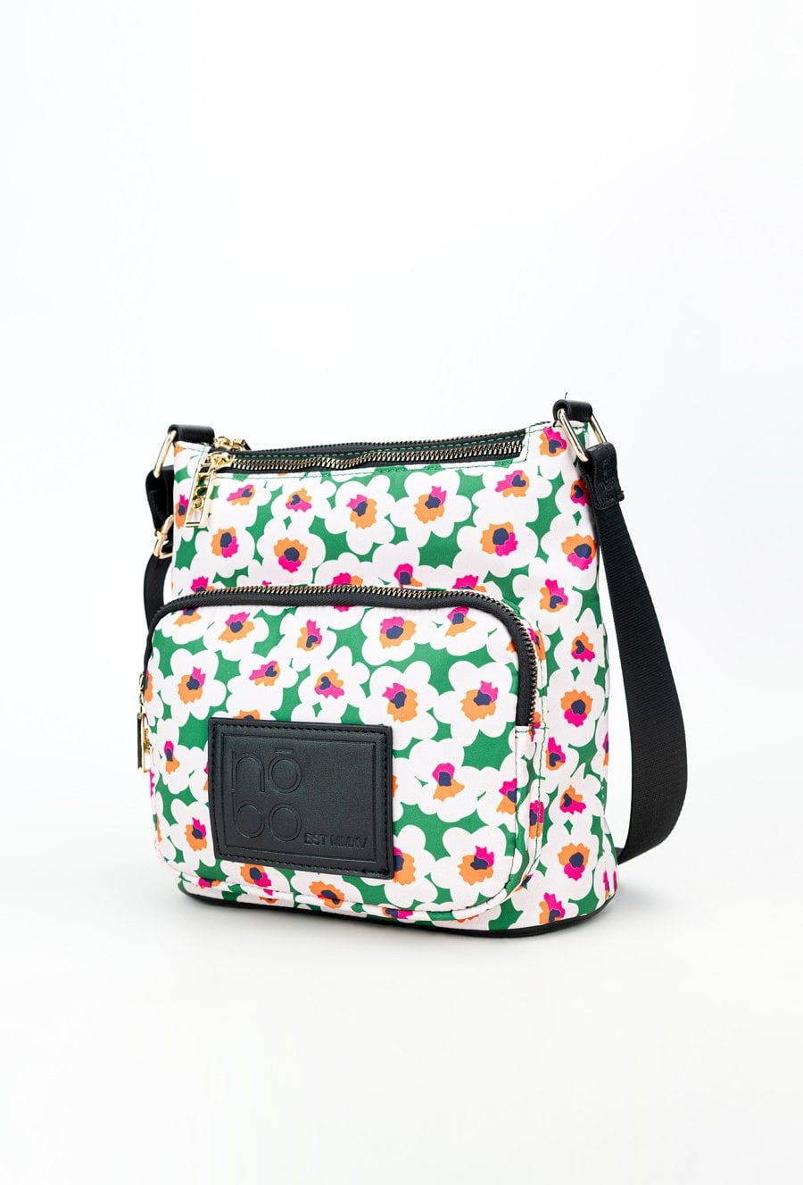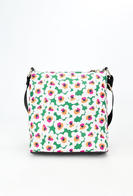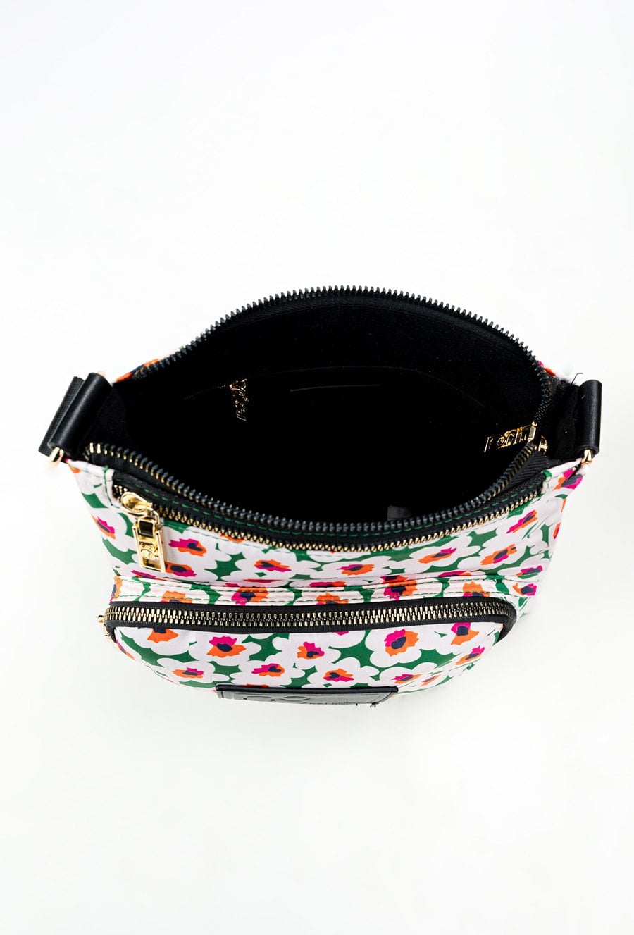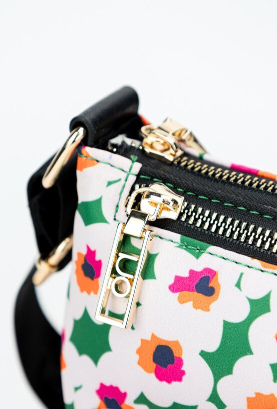 Tekstylna torebka damska z wzorzystym, kwiatowym wzorem. Torba jednokomorowa, wyposażona w praktyczne kieszonki wewnętrzne, idealne na drobiazgi. Z przodu znajdują się dwie kieszonki zapinane na suwak, zapewniające szybki dostęp do najpotrzebniejszych rzeczy. Dzięki swojemu stylowemu designowi, torba doskonale dopełni wiosenne stylizacje. Torbę należy przechowywać w dołączonym woreczku. Wymiary: 24 cm x 22 cm x 7 cm.