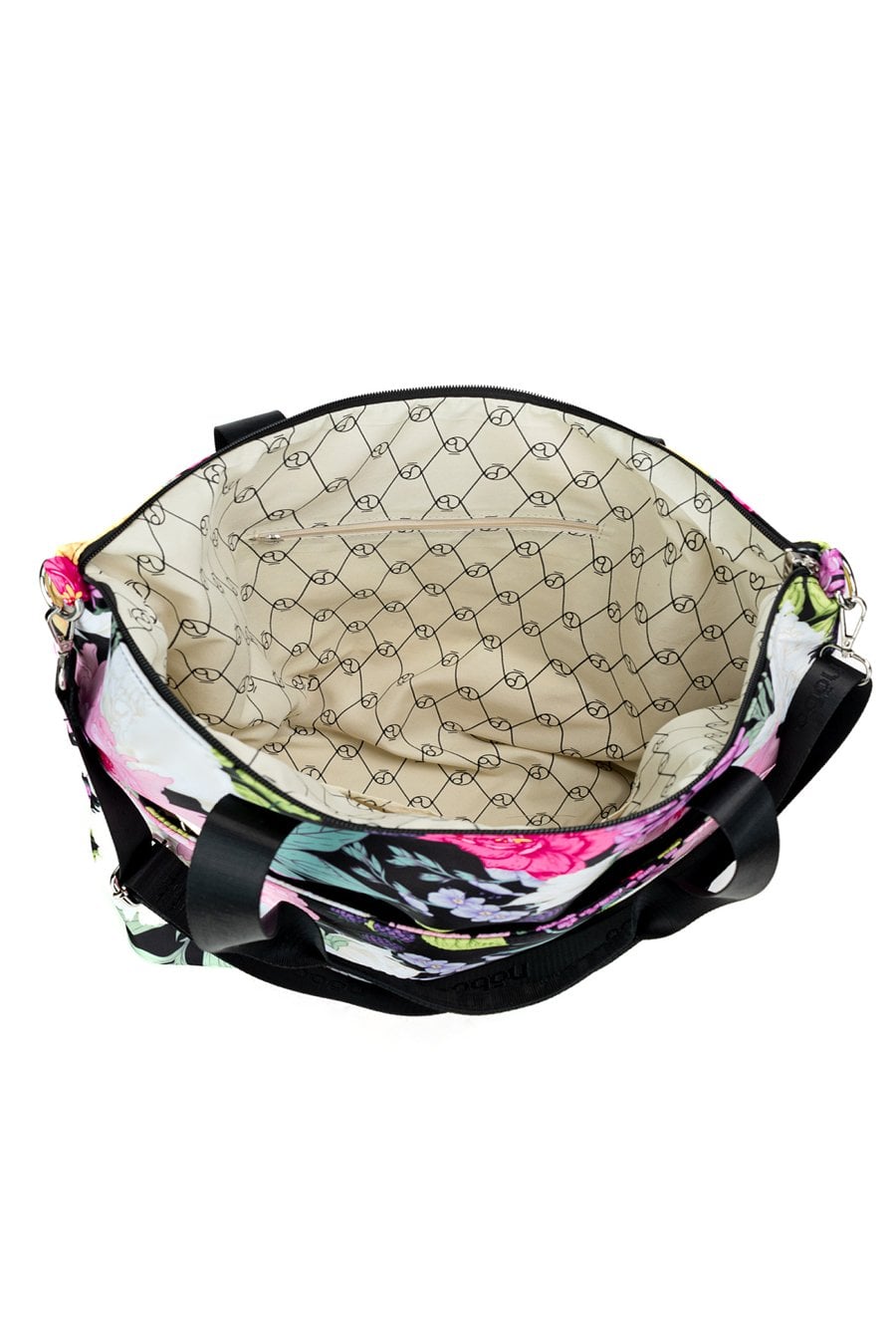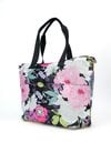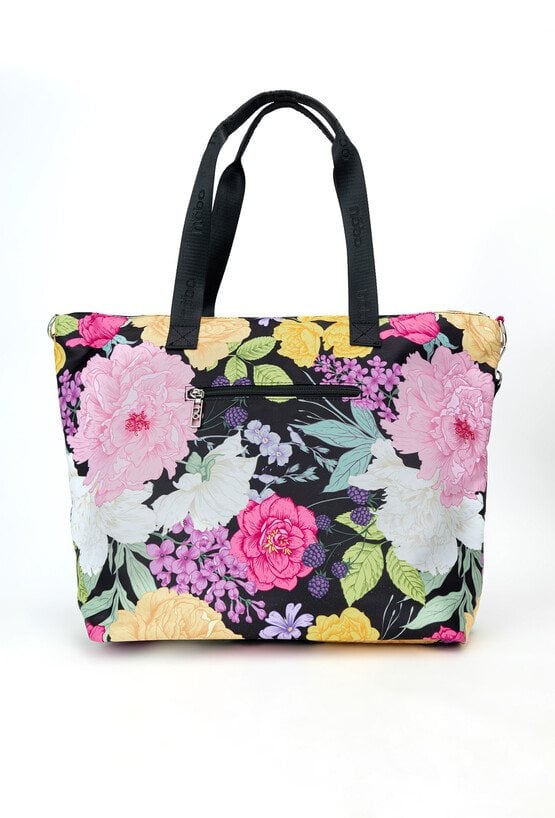 Torba damska z kwiatowym wzorem o wymiarach 48 cm x 36 cm x 5 cm, łącząca pojemność z wygodą. Jednokomorowa, z dodatkowymi kieszonkami na drobiazgi, które ułatwiają organizację. Można ją nosić na rączkach lub na regulowanym pasku dołączonym do zestawu. Praktyczne kieszonki z przodu i z tyłu zapewniają szybki dostęp do najpotrzebniejszych rzeczy. Idealna na co dzień. Torbę należy przechowywać w dołączonym woreczku.