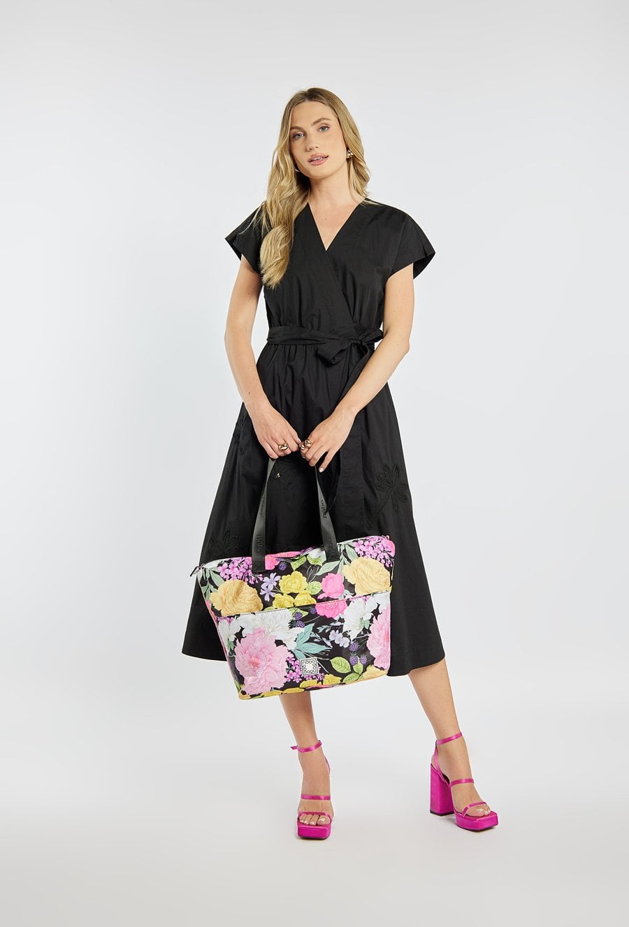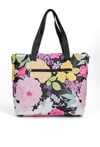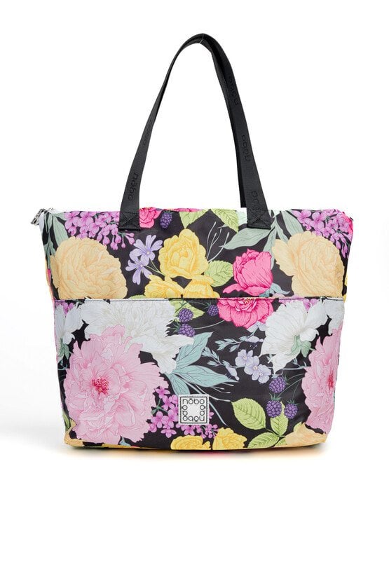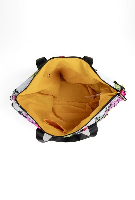 Torba damska z kwiatowym wzorem o wymiarach 48 cm x 36 cm x 5 cm, łącząca pojemność z wygodą. Jednokomorowa, z dodatkowymi kieszonkami na drobiazgi, które ułatwiają organizację. Można ją nosić na rączkach lub na regulowanym pasku dołączonym do zestawu. Praktyczne kieszonki z przodu i z tyłu zapewniają szybki dostęp do najpotrzebniejszych rzeczy. Idealna na co dzień. Torbę należy przechowywać w dołączonym woreczku.