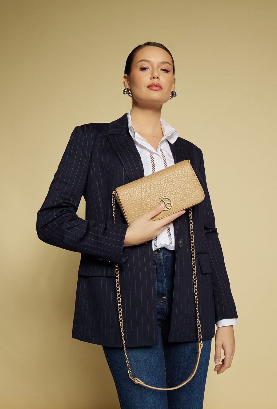 Elegancka wizytowa torebka damska o wymiarach 22 cm x 12 cm x 3,5 cm. Stylowa i funkcjonalna – jednokomorowa, z dodatkową kieszonką na drobiazgi. Zapinana na klapę z napą, subtelnie podkreślona paskiem z ozdobnym łańcuszkiem. Idealny dodatek na wyjątkowe okazje. Torbę należy przechowywać w dołączonym woreczku.